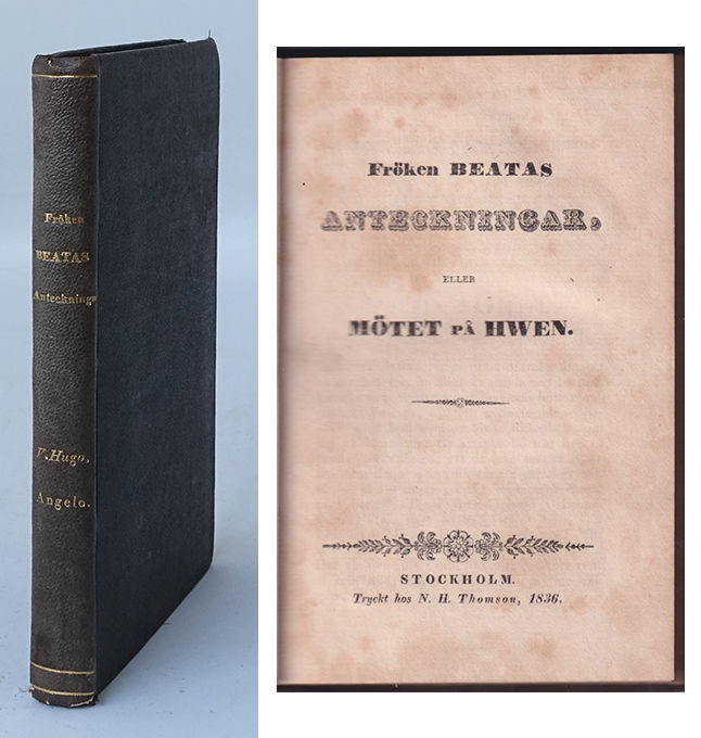 Sthlm, N. H. Thomson, 1836. Liten 8:o. 115 s. + HUGO, VICTOR. Angelo, tyrann i Padua. Dram. Öfversatt af A. G. Sthlm, N. H. Thomson, 1836. Liten 8:o. 118,(2 blanka) s. Samtida lätt nött brunt klbd med titel i guld på ryggen och brunstänkta snitt. De första och sista bladen lagerfläckiga, i övrigt med några spridda lagerfläckar. Med Johan Sederholms namnteckning på försättsbladet. Från Näfveqvarn. Med stpl, numrering och gallringsstpl från Sigtunastiftelsen.