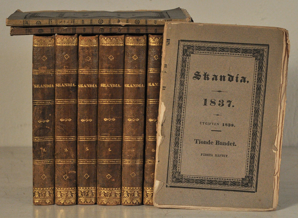 Lundstedt Sveriges periodiska litteratur 1287. Almquistiana 303-04. Allt som utkom förutom det saknade häftet IX:2. Rättelselapparna till del IV och VI återfinns infästa längst bak i volymerna och innehåller tryckuppgifter. De två hoppen i pagineringen har uppstått på grund av slarv vid sättningen. Utgavs av Svenska litteratur-föreningen parallellt med deras ordinarie tidning, ”Svenska litteratur-föreningens tidning”, som främst skulle innehålla anmälningar av nyutkommen litteratur. ”Skandia” samlade de vetenskapliga artiklarna och varje del utkom i två häften. Bland skribenterna märks bl.a. Atterbom och Almquist.