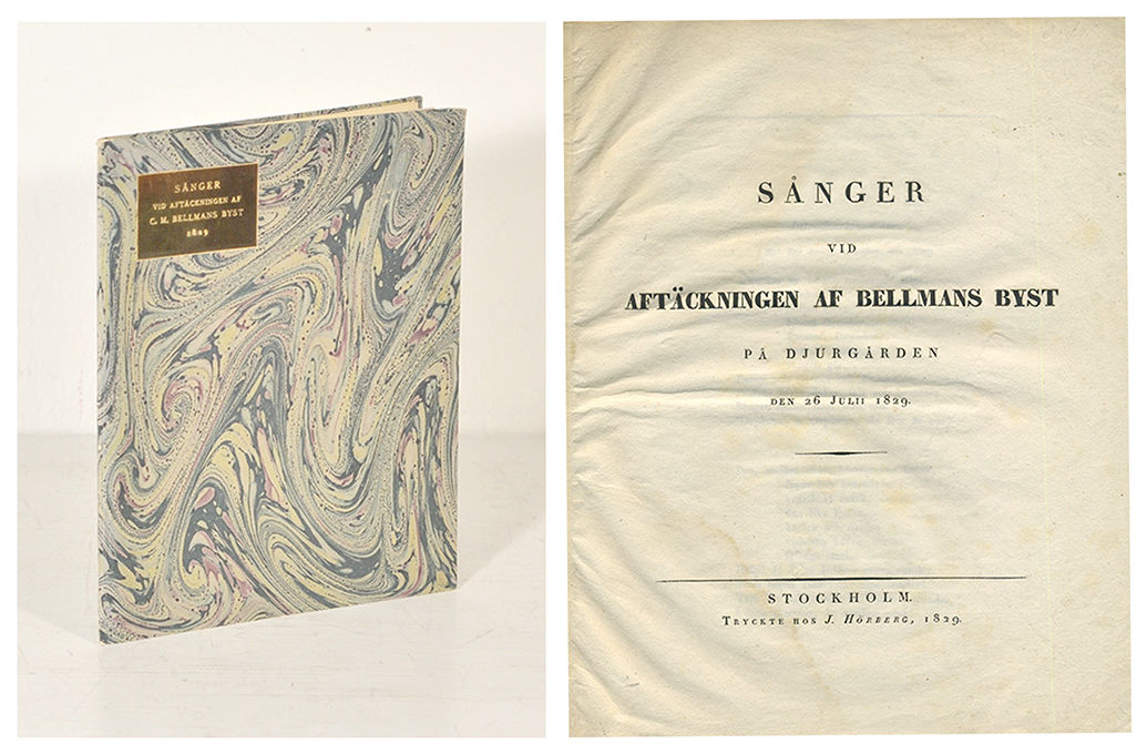 Sthlm, J. Hörberg, 1829. 4:o. 9 s. Elegant marmorerat pappbd med brun titeletikett på främre pärmen. Inlagan med fuktrand. Med A. Mårtensons blyertsnamnteckning från 1953.