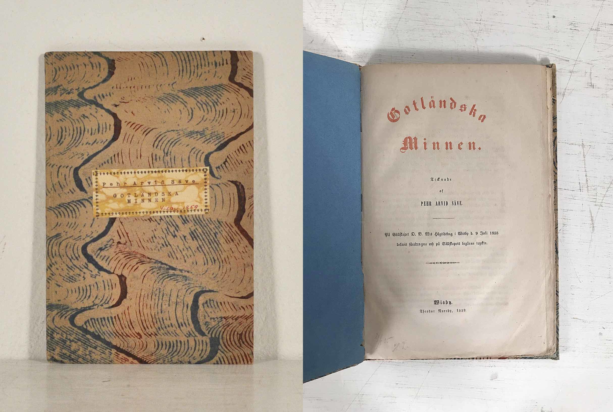 Visby, T. Norrby, 1859. 8:o. (2),45,(1 blank,2) s. Titelbladet tryckt i rött och svart. Enkelt marmorerat pappband från 1900-talets mitt med gulmarmorerad maskinskriven titeletikett på frampärmen. Det tryckta blå omslaget medbundet, det främre något loss nedtill. En fuktrand i övre marginalen i sista arket från s. 33 och framåt. Det sista bladparet ouppskuret. Bra ex.