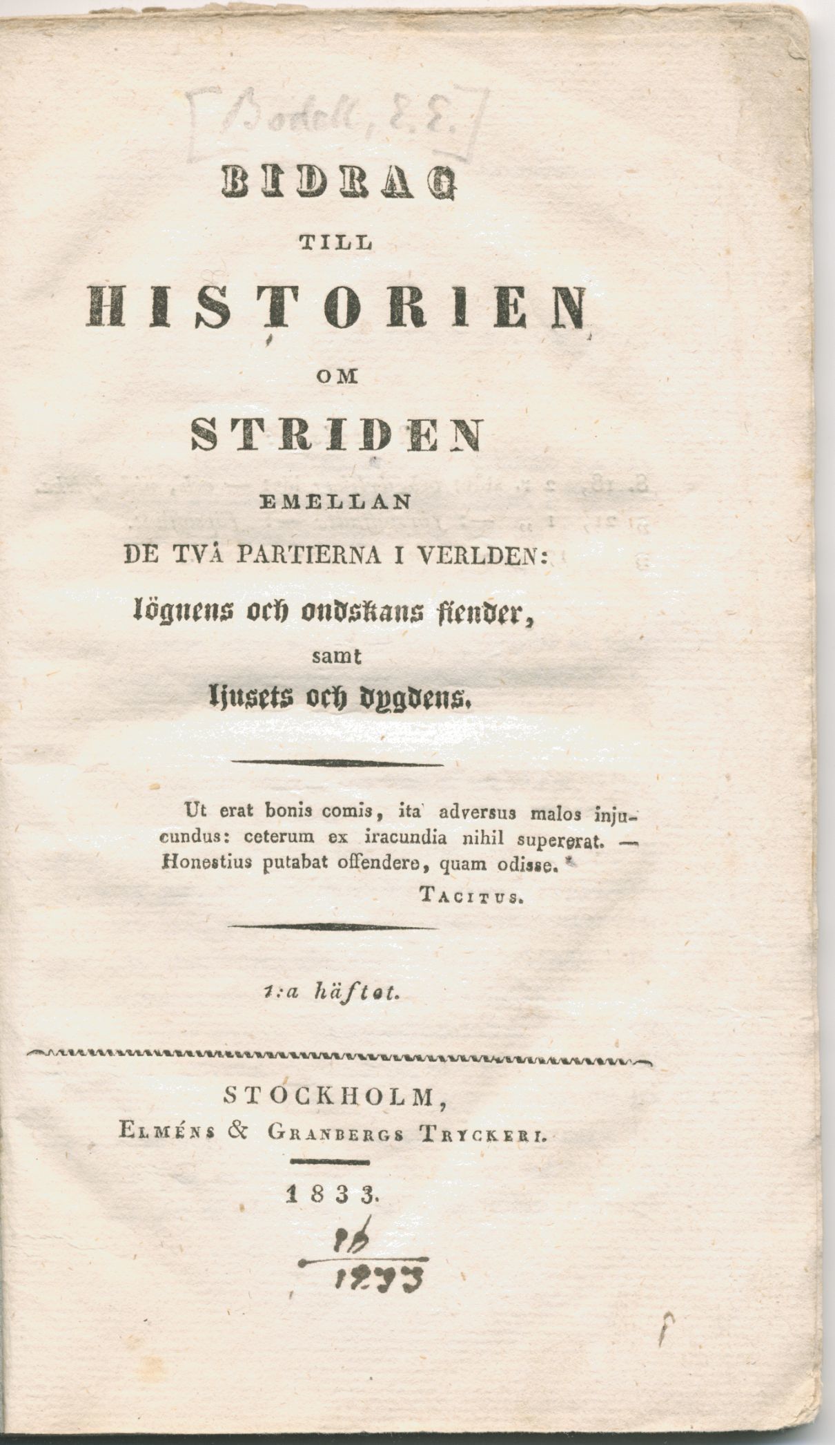 Bidrag till historien om striden emellan de två partierna i verlden: lögnens och ondskans fiender, samt ljusets och dygdens. 1:a häftet.