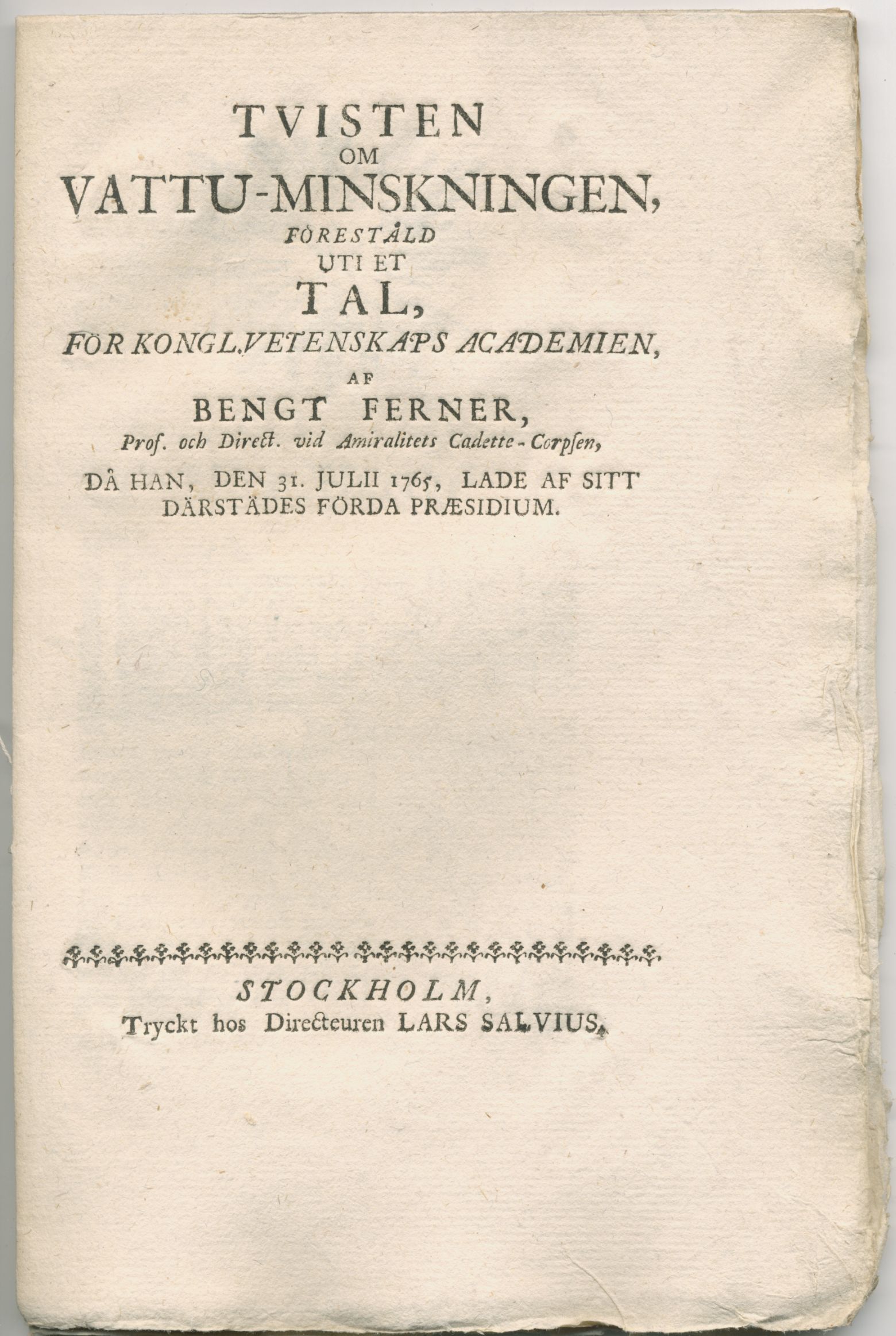 Tvisten om vattu-minskningen, förestäld uti ett tal, för kongl. Vetenskaps academien [...] då han, den 31 julii 1765, lade af sitt därstädes förda præsidium.