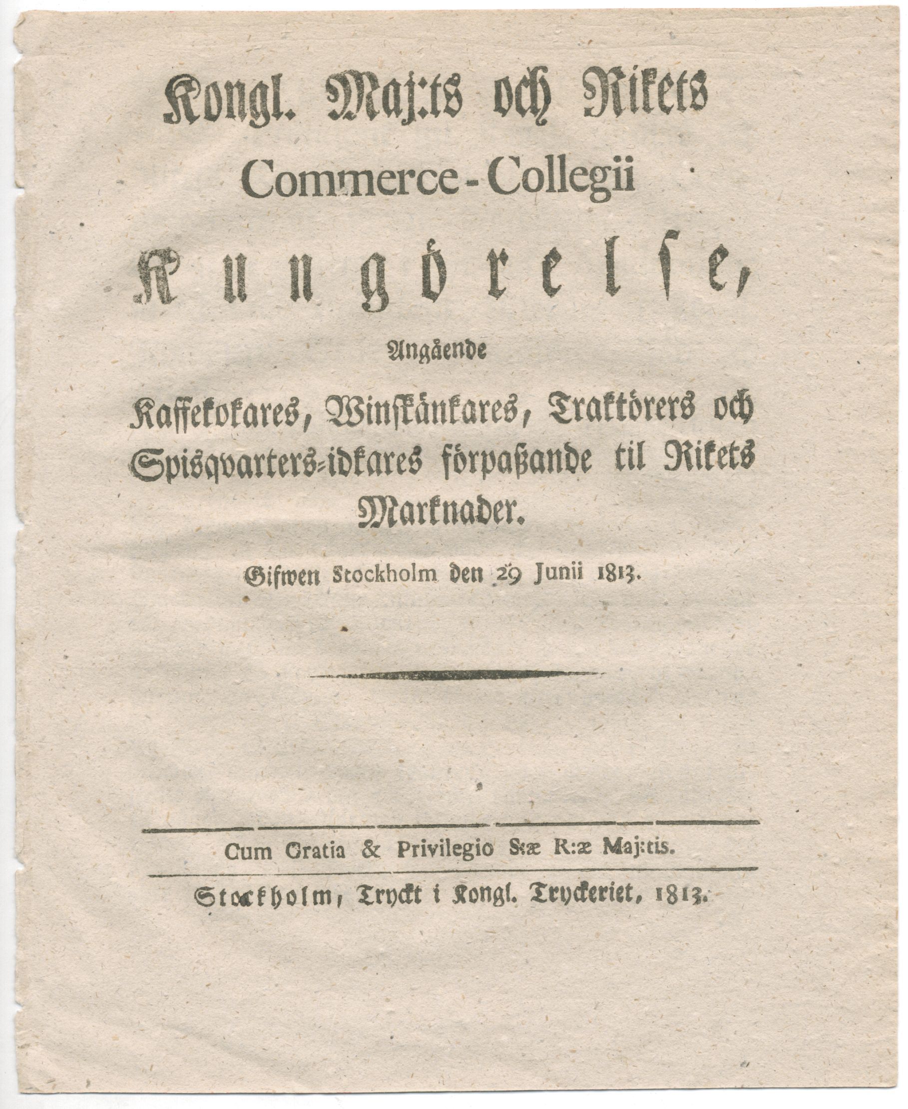 Kongl. maj:ts och rikets Commerce-collegii kungörelse, angående kaffekokares, winskänkares, traktörers och spisqvarters-idkares förpassande til rikets marknader. Gifwen Stockholm den 29 junii 1813.