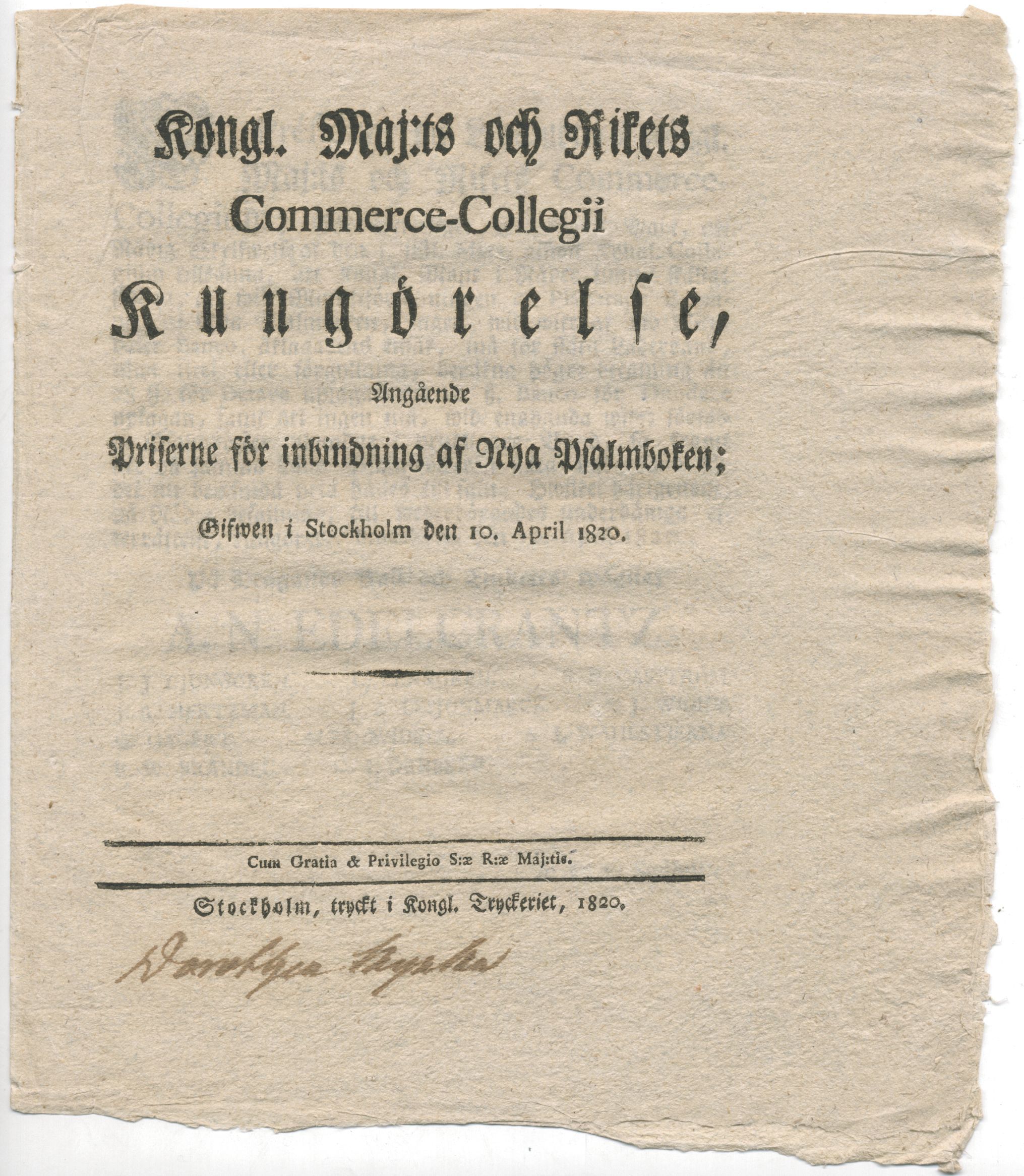 Kongl. maj:ts och rikets Commerce-collegii kungörelse, angående priserne för inbindning af nya psalmboken; gifwen i Stockholm den 10 april 1820.