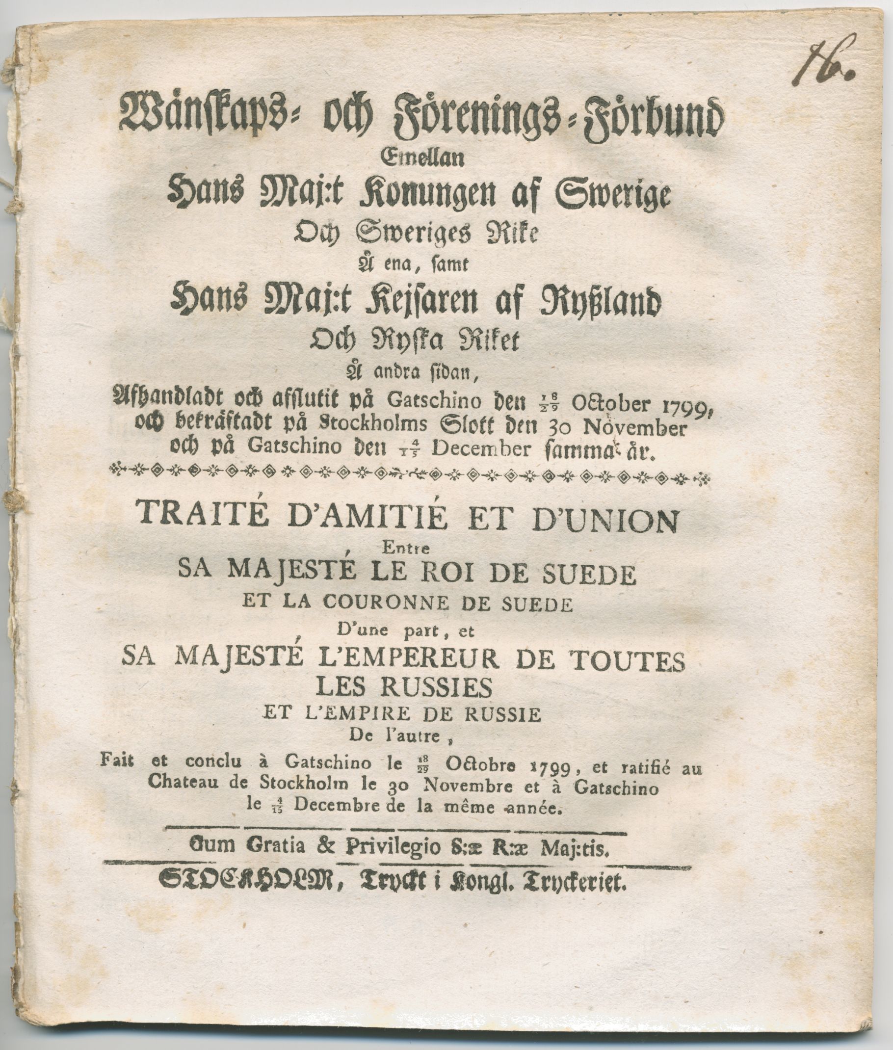 Wänskaps- och förenings-förbund emellan hans maj:t konungen af Swerige och Sweriges rike å ena, samt hans maj:t kejsaren af Ryssland och ryska riket å andra sidan, afhandladt och afslutit på Gatschino den 18/29 october 1799, och bekräftadt på Stockholms slott den 30 november och på Gatschino den 4/15 december samma år. Traité d’amitié et d’union entre sa majesté le roi de Suede et la couronne de Suede d’une part, et sa majesté l’empereur de toutes les russies et l’empire de Russie de l’autre, fait et conclu à Gatschino le 18/29 octobre 1799, et ratifié au château de Stockholm le 30 novembre et à Gatschino le 4/15 decembre de la même année.