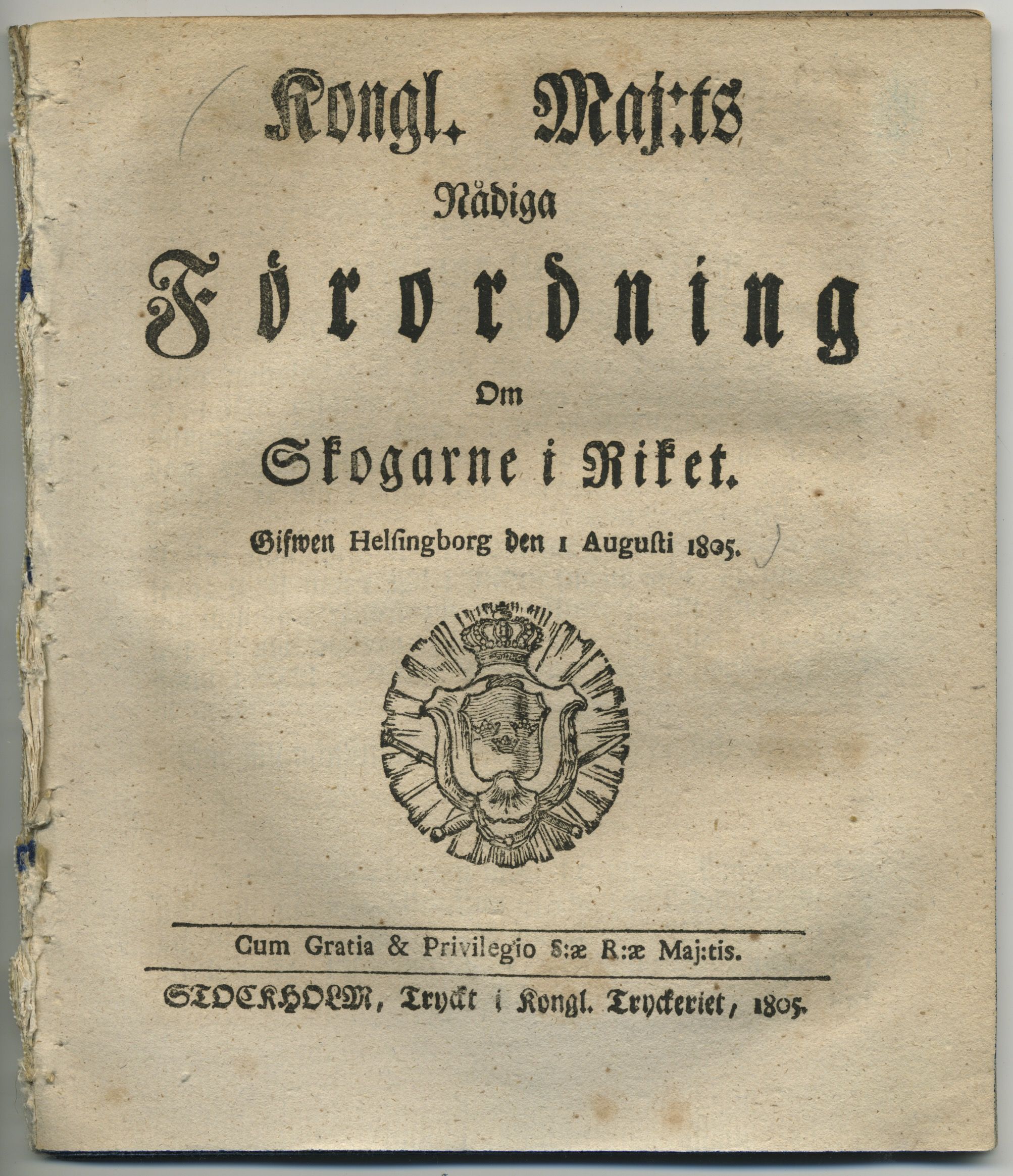 Kongl. maj:ts nådiga förordning om skogarne i riket. Gifwen Helsingborg den 1 augusti 1805.