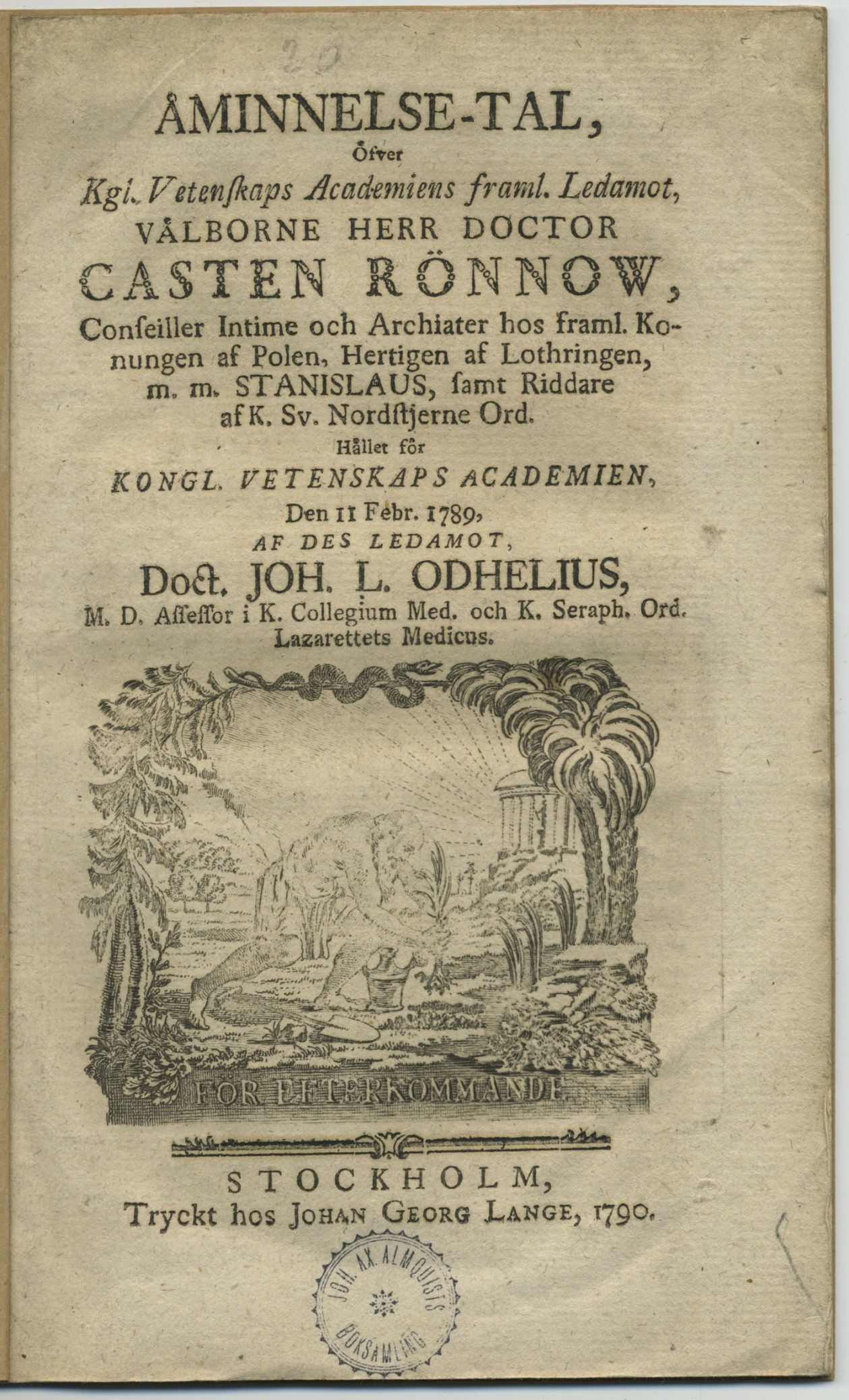 Åminnelse-tal, öfver kgl. Vetenskaps academiens framl. ledamot, välborne herr doctor Casten Rönnow, conseiller intime och archiater hos framl. konungen af Polen, hertigen af Lothringen, m.m. Stanislaus, samt riddare af k. sv. Nordstjerne ord. Hållet för kongl. Vetenskaps academien den 11 febr. 1789.