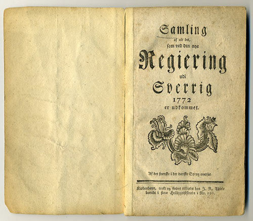 Setterwall 3359. Dansk översättning av svenska tryckta handlingar i samband med statsvälvningen 1772, alltifrån Hellichius manifest den 12 augusti till Gustav III:s tal den 9 september. En ny utökad upplaga utkom 1790.