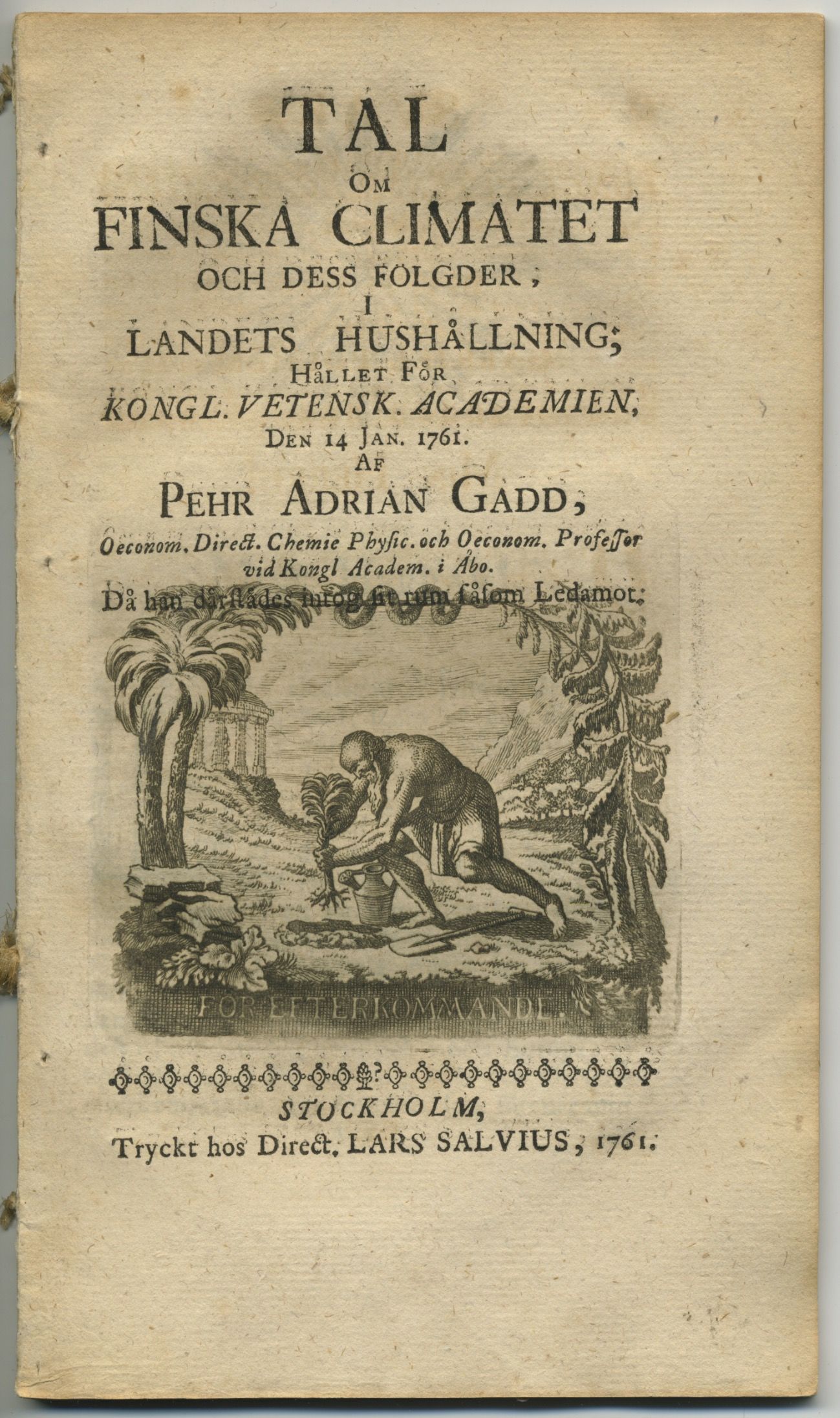 Tal om finska climatet och dess fölgder i landets hushållning; hållet för kongl. Vetensk. academien den 14 jan. 1761. [...]. Då han därstädes intog sit rum såsom ledamot.