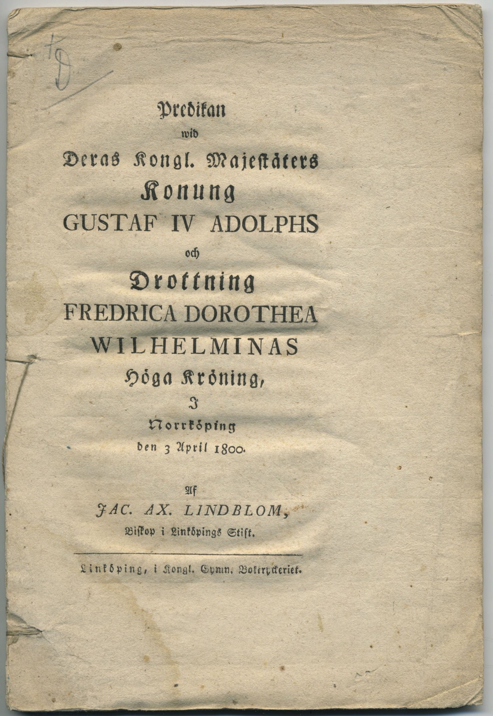 Predikan wid deras kongl. majestäters konung Gustaf IV Adolphs och drottning Fredrica Dorothea Wilhelminas höga kröning, i Norrköping den 3 april 1800.