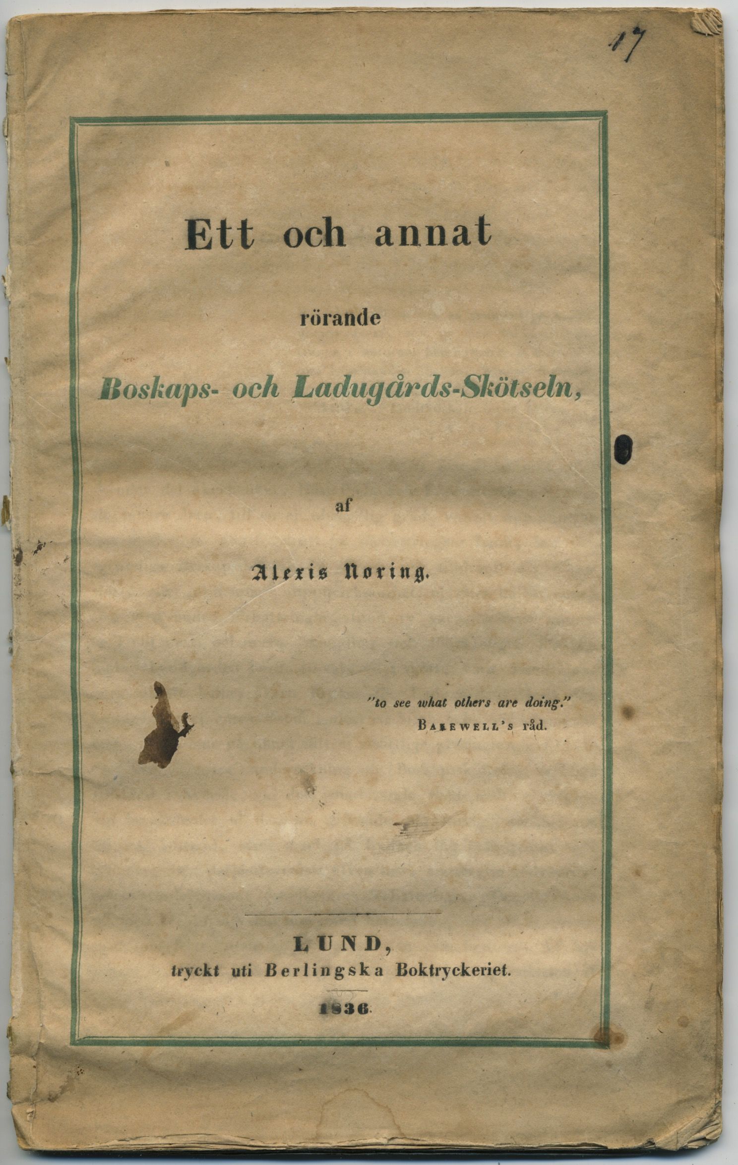 Hebbe Den svenska lantbrukslitteraturen 2152. Alexis Noring (1799-1844) var bland annat utgivare av ”Qvartal-skrift för landtbruk och husdjursskötsel”. Bakre omslag med reklam för denna tidskrift med uppgifter om prenumerationspris.