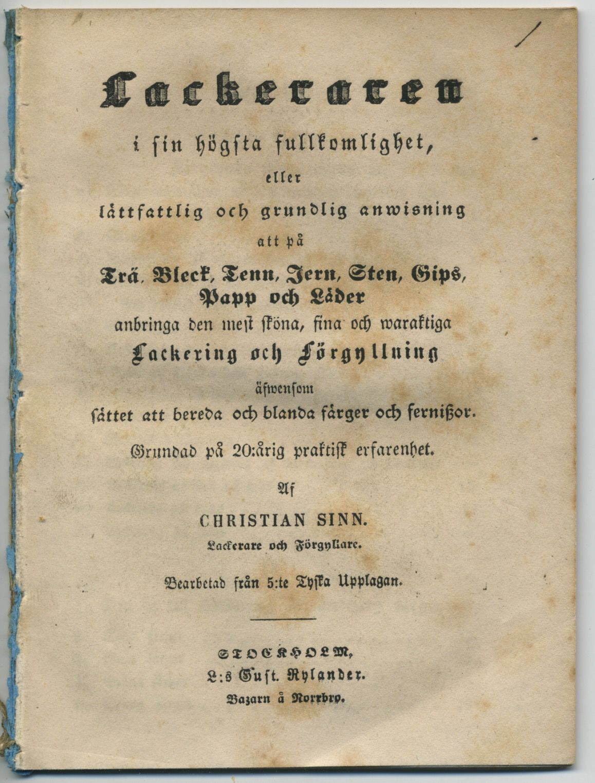 Lackeraren i sin högsta fullkomlighet, eller lättfattlig och grundlig anvisning att på trä, bleck, tenn, jern, sten, gips, papp och läder anbringa den mest sköna, fina och waraktiga lackering och förgyllning äfvensom sättet att bereda och blanda färger och fernissor. Grundad på 20:årig praktisk erfarenhet. Bearbetad från 5:te tyska upplagan.