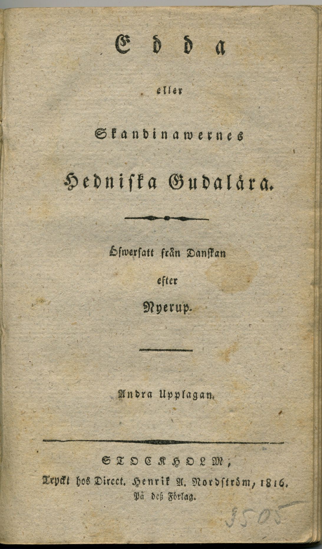Edda eller skandinawernes hedniska gudalära. Öfwersatt från danskan efter Nyerup. Andra upplagan.