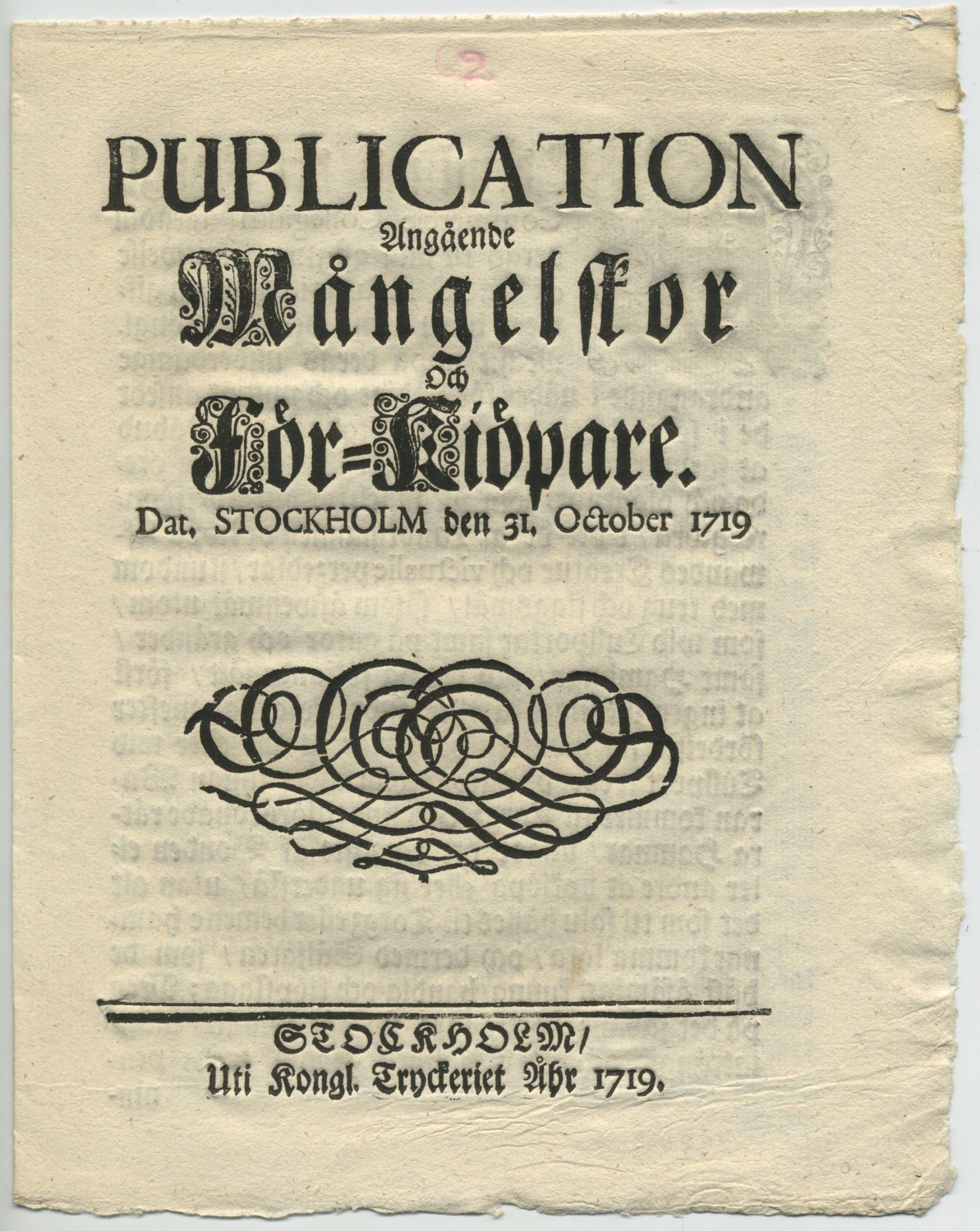 Publication angående mångelskor och för-kiöpare. Dat. Stockholm den 31 october 1719.