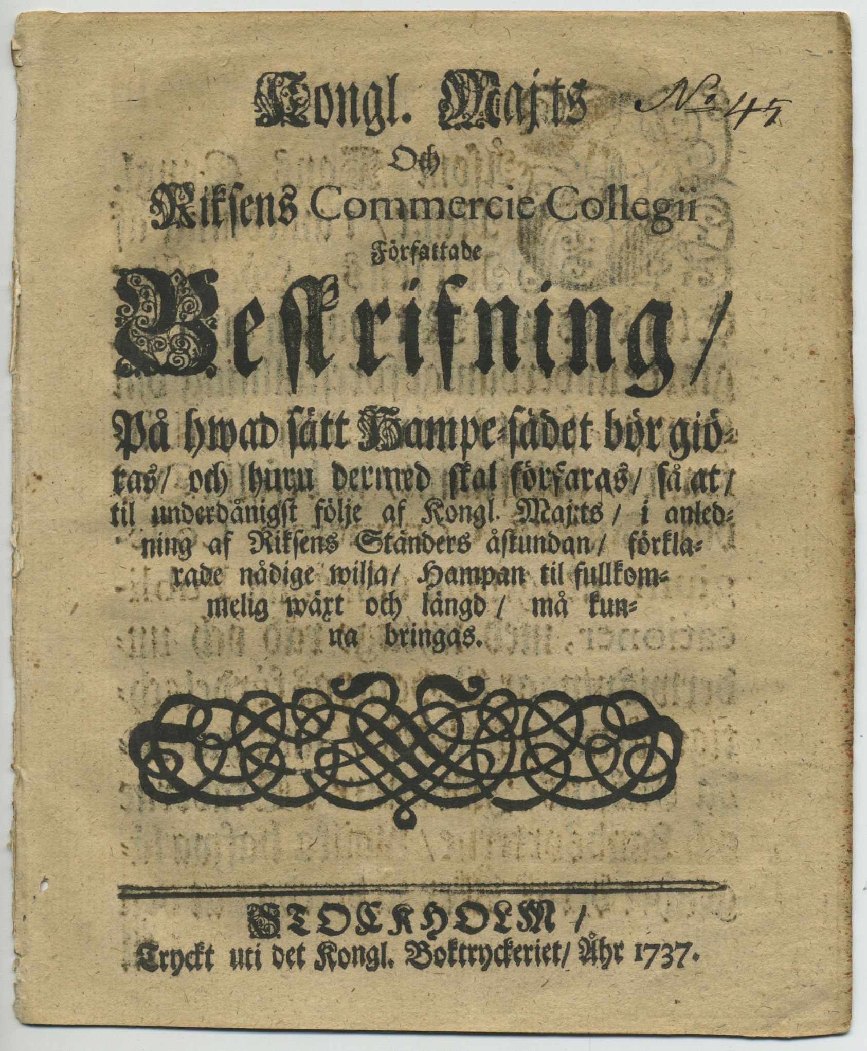 Kongl. maj:ts och riksens Commercie collegii författade beskrifning/ på hwad sätt hampe-sädet bör giöras/ och huru dermed skal förfaras/ så at/ til underdånigst följe af kongl. maj:ts/ i anledning af riksens ständers åstundan/ förklarade nådige wilja/ hampan til fullkommelig wäxt och längd/ må kunna bringas.