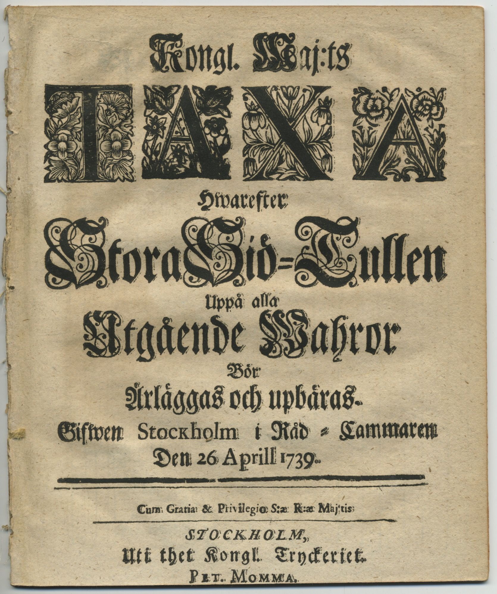 Kongl. maj:ts taxa hwarefter stora siö-tullen uppå alla utgående wahror bör ärläggas och upbäras. Gifwen Stockholm i råd-cammaren den 26 aprill 1739.