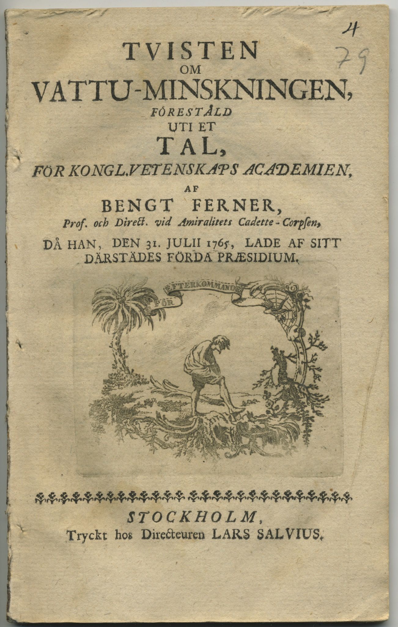 Tvisten om vattu-minskningen, förestäld uti ett tal, för kongl. Vetenskaps academien [...] då han, den 31 julii 1765, lade af sitt därstädes förda præsidium.