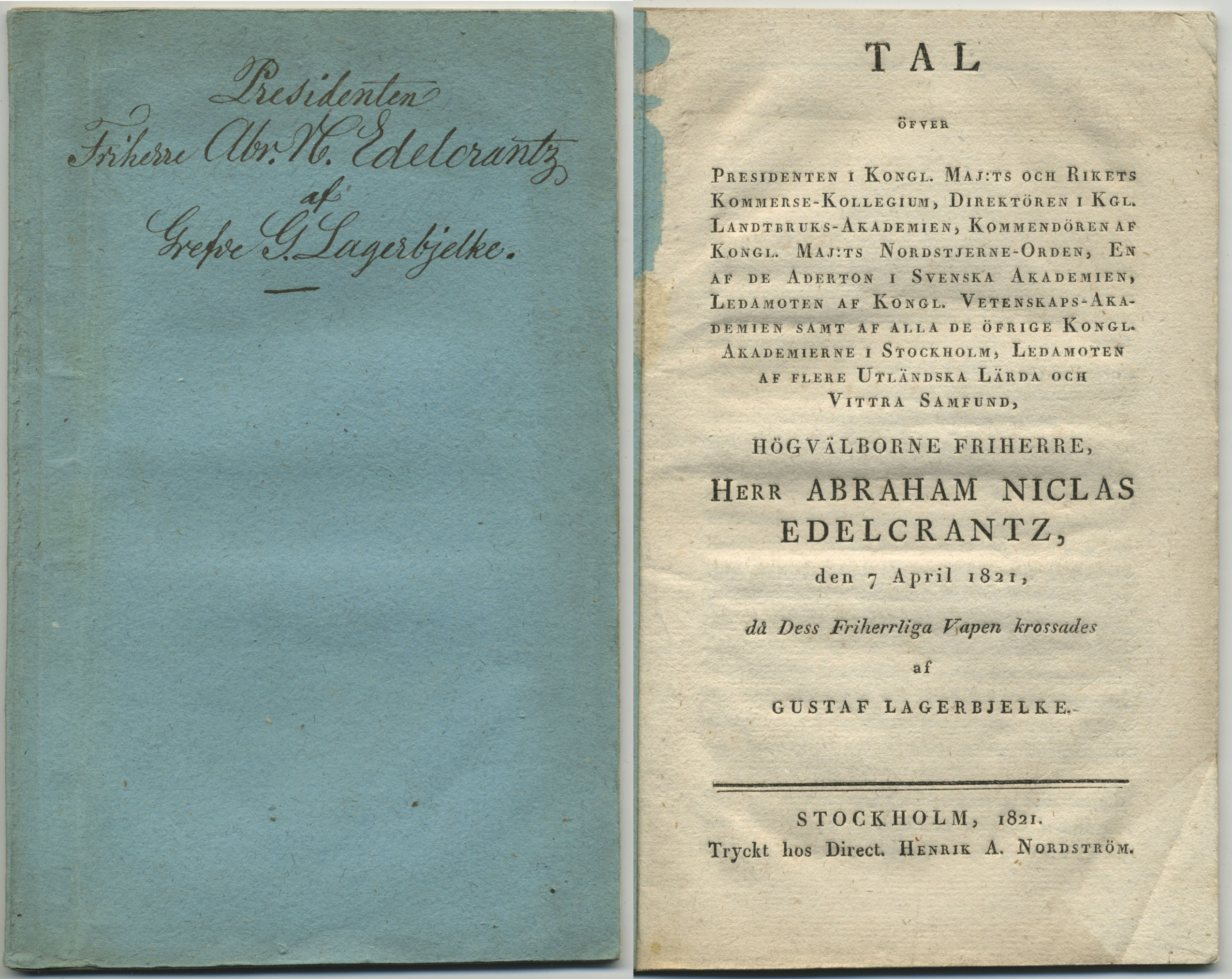 Tal öfver presidenten i kongl. maj:ts och rikets Kommerse-kollegium, direktören i kgl. Landtbruks-akademin, kommendören af kongl. maj:ts Nordstjerne-orden, en af de aderton i Svenska akademien, ledamoten af kongl. Vetenskaps-akademien samt af alla de öfrige kongl. akademierne i Stockholm, ledamoten af flere utländska lärda och vittra samfund, högvälborne friherre, herr Abraham Niclas Edelcrantz, den 7 april 1821, då dess friherrliga vapen krossades.