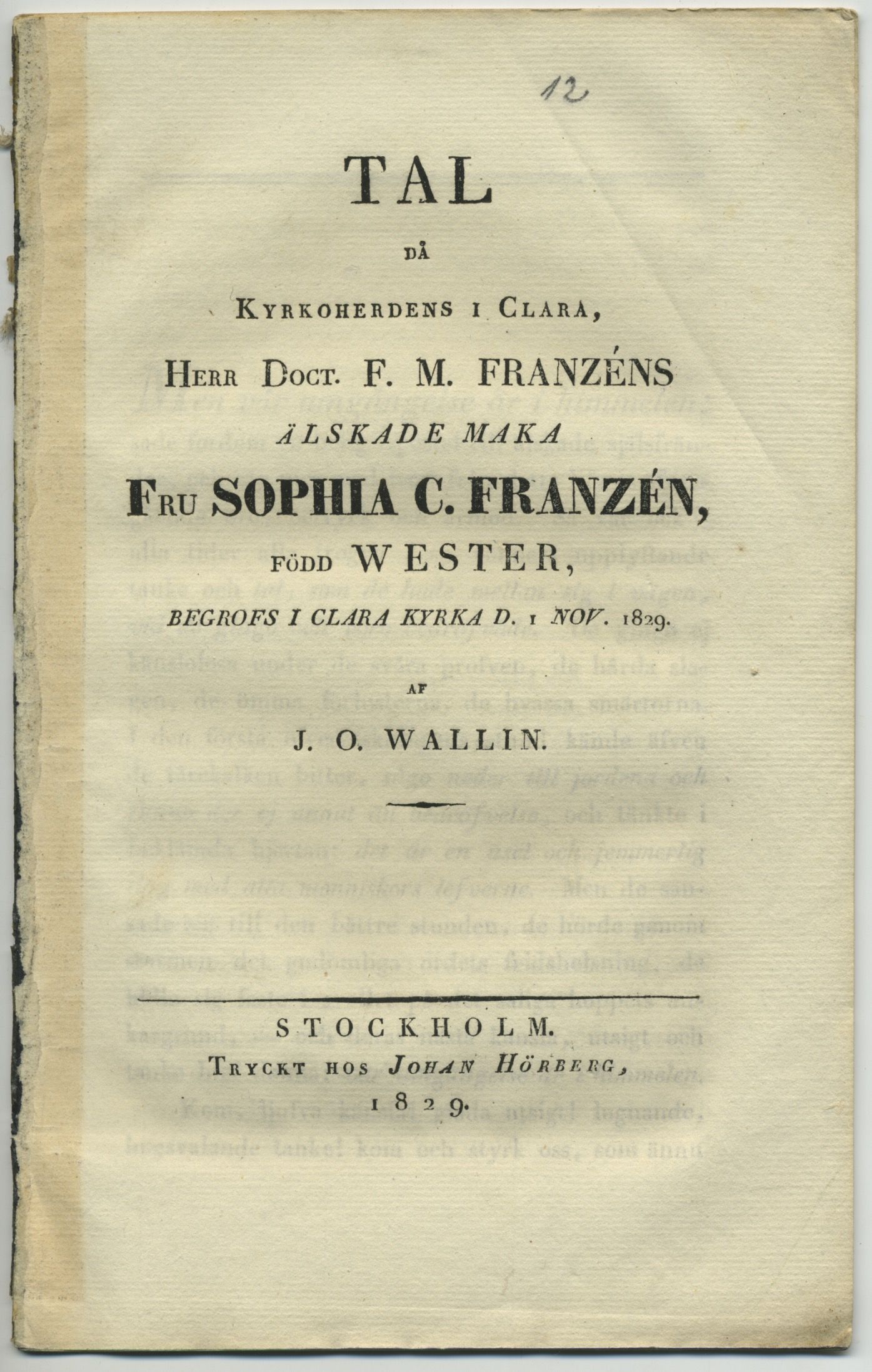 Tal då kyrkoherdens i Clara, herr doct. F. M. Franzéns älskade maka fru Sophia C. Franzén, född Wester, begrofs i Clara kyrka d. 1 nov. 1829.