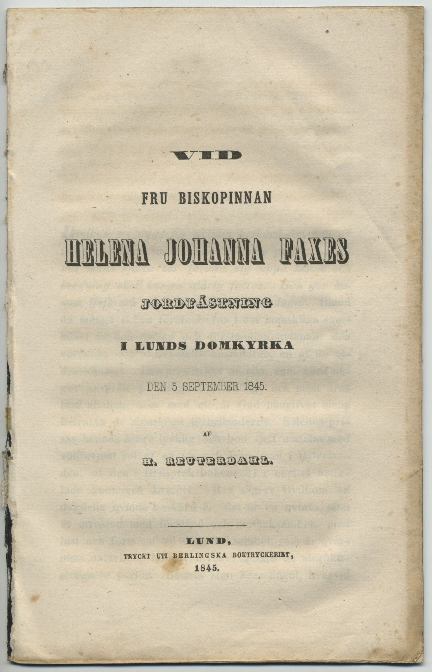 Vid fru biskopinnan Helena Johanna Faxes jordfästning i Lunds domkyrka den 5 september 1845.