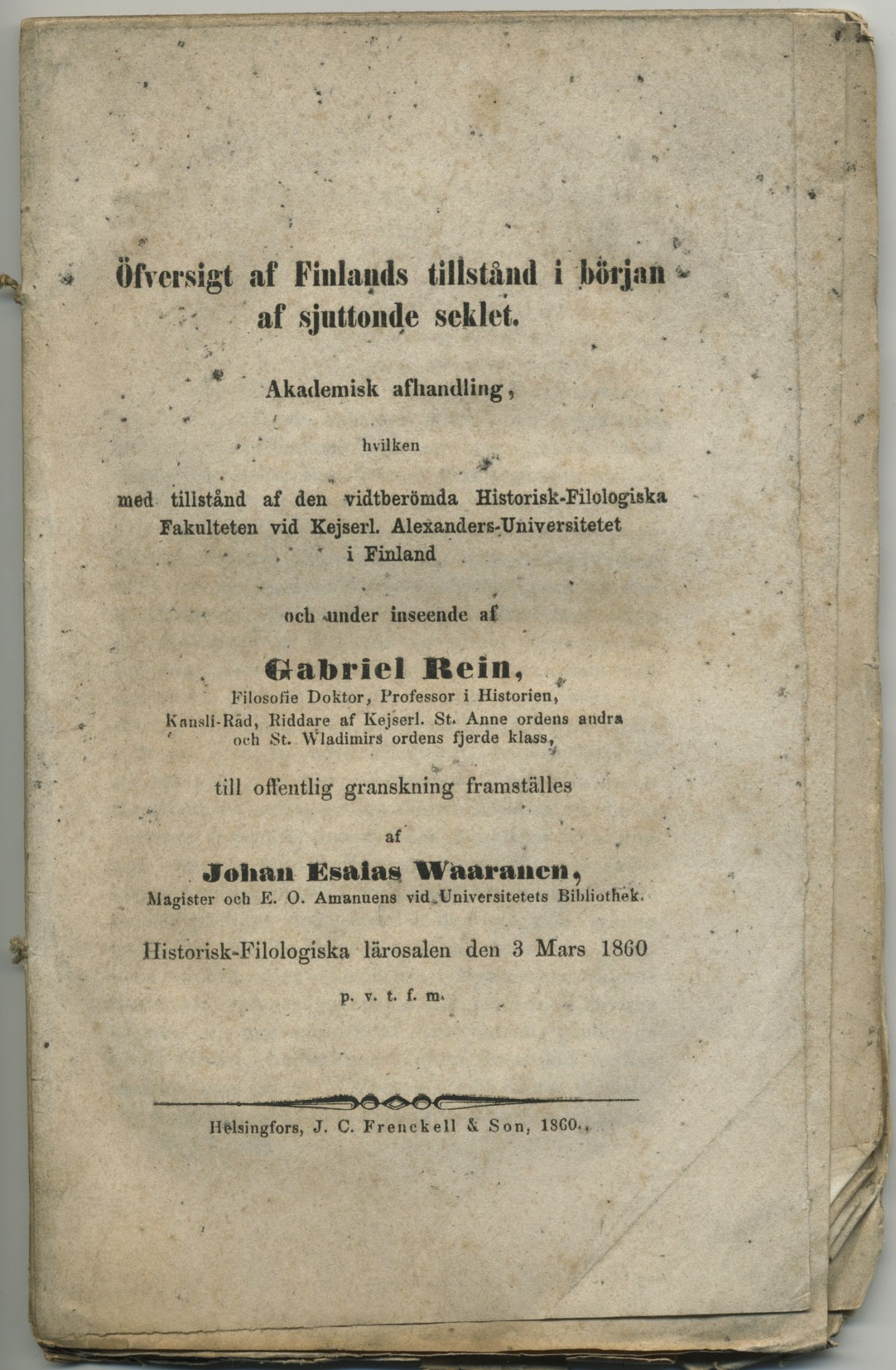 Helsingfors, J. C. Frenckell & son, 1860. 8:o. (2),69,(1 blank),XII s. Häftad, oskuren och ouppskuren med två bindgarn varav det nedre trasigt. Enstaka lager- och småfläckar. Titelbladet gråtonat med många minimala svarta fläckar.