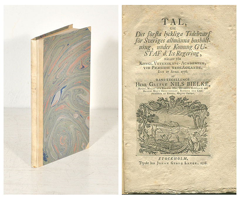 Sthlm, J. G. Lange, 1776. 8:o. 123 s. Med inklistrad grav. titelvinjett. Halvpergamentbd från 1900-talets mitt med knappt urskiljbar handskriven ryggtitel. Bra närmast oskuren inlaga. Några blad ouppskurna. Ur Hjalmar Gustafssons bibliotek.