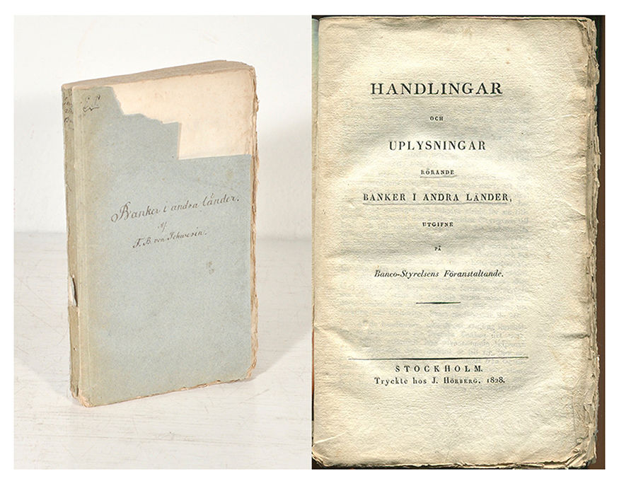 Hesse Svensk numismatisk bibliografi 1556. Aktsamlingen innehåller ett antal stiftelsebrev, statuter och reglementen för olika nationalbanker. Fredrik Bogislaus von Schwerin (1764-1834), svensk greve, präst, riksdagsman och finansman.
