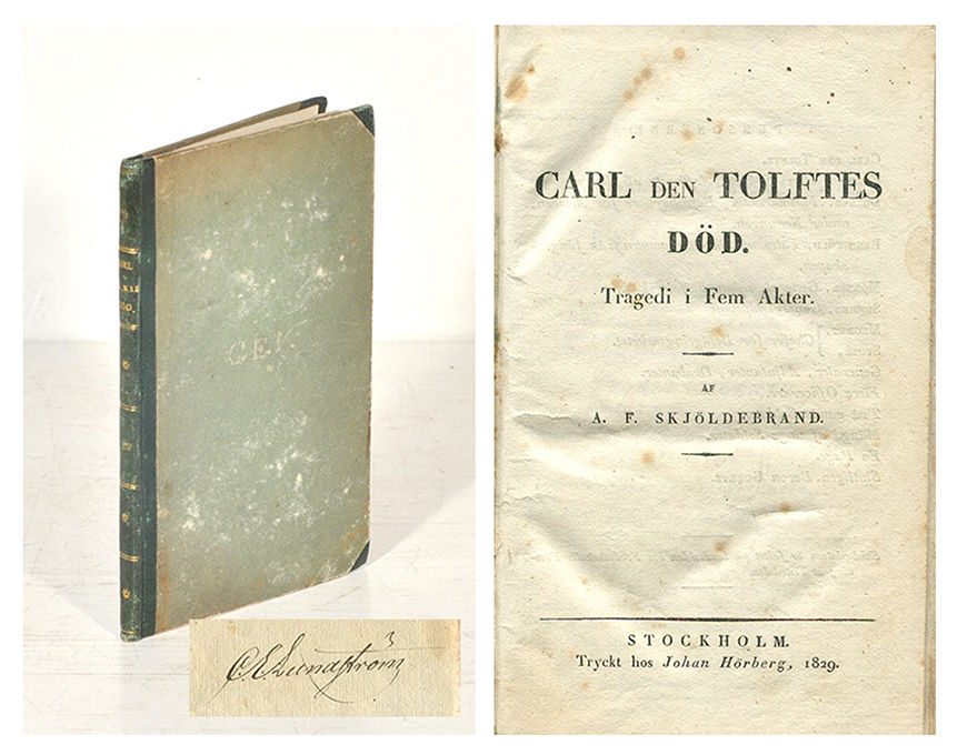 Sthlm, J. Hörberg, 1829. 8:o. 74 s. Något nött samtida grönt halvsaffianbd med guldornerad rygg. Rödstänkta snitt. Något avnötta pärmar. Till stor del rätt hårt lagerfläckig. C. E. Lundströms namnteckning och hans nästan avnötta guldmonogram ”C. E. L.” på frampärmen.