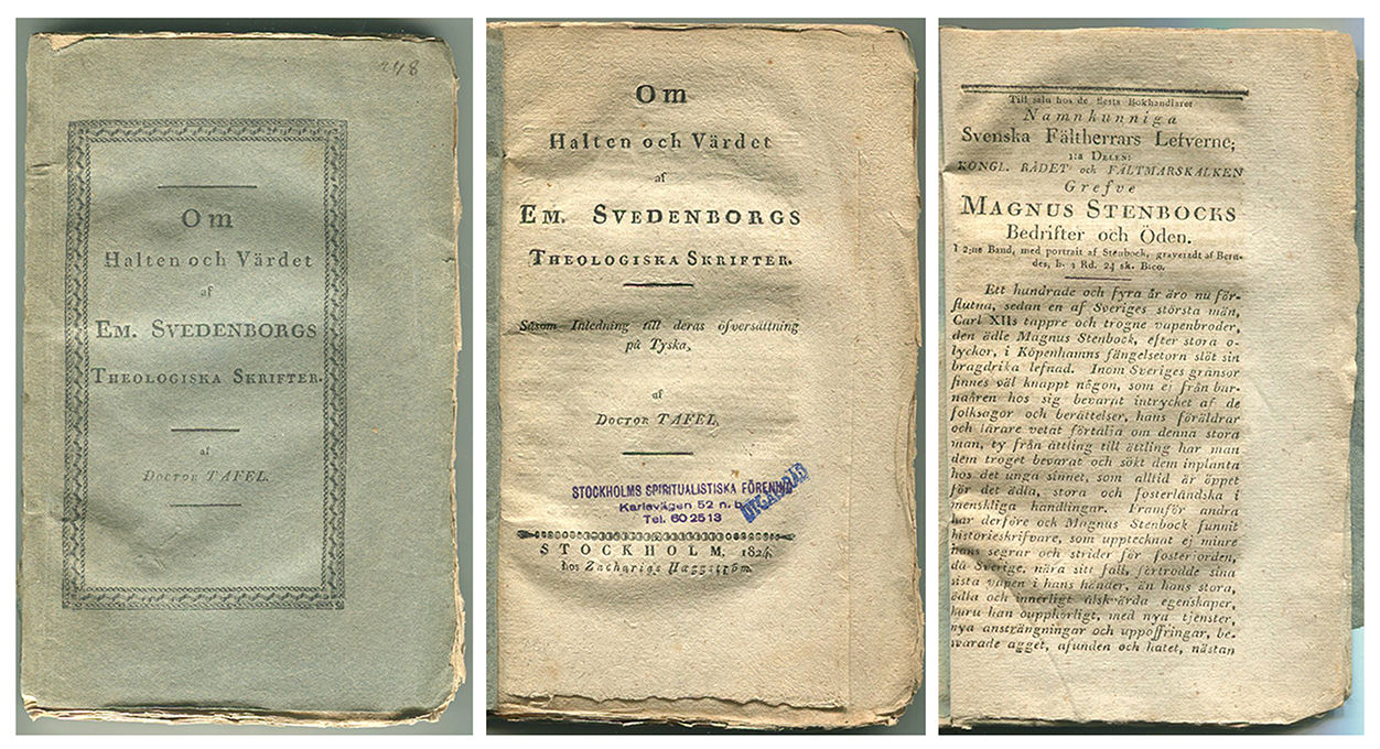 Sthlm, Z. Hæggström, 1824. 8:o. (2),113 s. + Till salu hos de flesta bokhandlarer Namnkunniga svenska fältherrars lefverne; 1a delen: Kongl. rådet och fältmarskalken grefve Magnus Stenbocks bedrifter och öden. [=rubrik]. (Sthlm, Z. Hæggström, 1824?). 8:o. (4) s. + Af trycket har utkommit och säljes hos de flesta bokhandlare och bokhandels-commissionairer i riket: Naturens under. Försök till en allmänt fattlig framställning af stjernkunnighetens och naturvetenskapernas resultater i deras sammanhang; af L. A. Kähler. [=rubrik]. Sthlm, Z. Haeggström, 1824. 8:o. (4) s. + Till salu hos förläggaren, boktryckaren Z. Haeggström i Stockholm, med vanlig rabbatt, samt hos herrar bokhandlare, och bokhandelscommissionärer i Sverige och Finnland, efter här utförda boklådspris. [=rubrik]. Sthlm, Z. Haeggström, 1824. 8:o. (8) s. Häftad och oskuren i tryckt gråpappersomslag, det bakre nästan loss och med stor bortriven bit nedtill med förlust i ramverket. Småskador och revor i omslagsryggen. Enstaka lagerfläckar. Stplr och gallringsstpl från Stockholms spiritualistiska förening. Främre omslagets insida med spår överst efter gammal auktionslapp och sista arbetets sista sidan med mindre spår upptill av vad som kan ha varit en lånekortsficka.