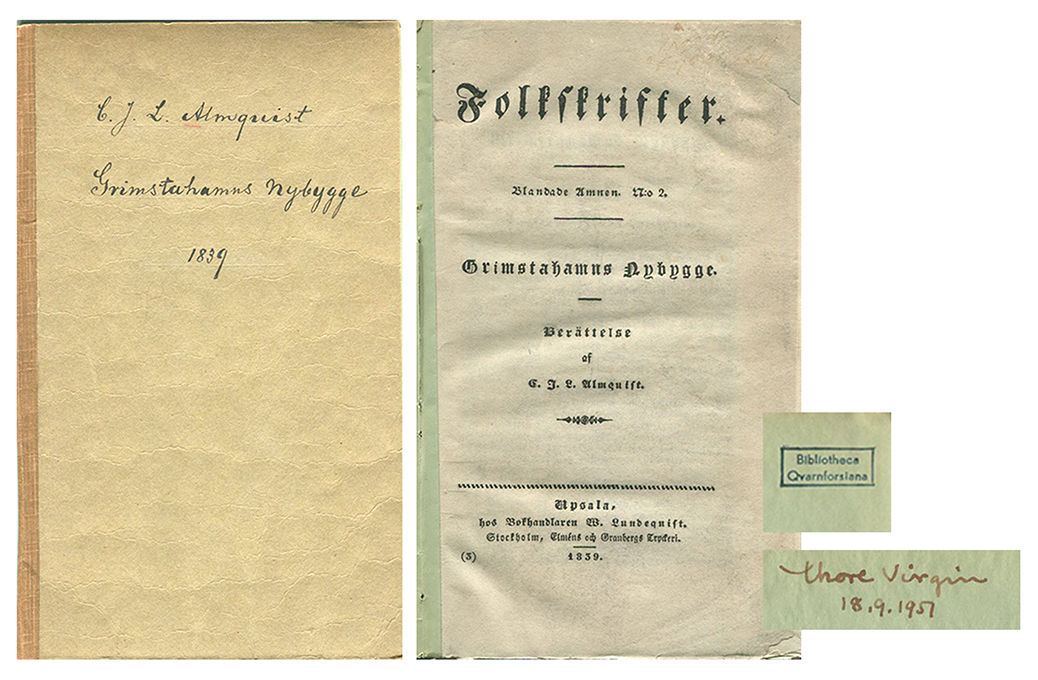 Sthlm, Elméns och Granbergs tryckeri, 1839. 8:o. 36 s. Häftad i enkelt brunt omslag med brun klotrygg. Handskriven titel på frampärmen. Titelbladet lätt trycksvärtesolkigt och med lagad liten reva i övre hörnet. Sista sidan gråtonad i övre marginalen. Thore Virgins namnteckning från 1951 och hans stpl Bibliotheca Qvarnforsiana.