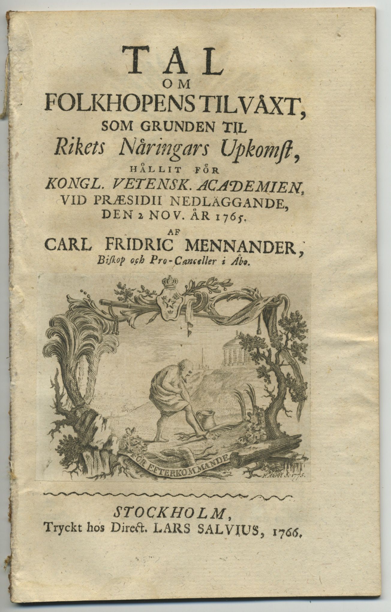 Tal om folkhopens tilväxt, som grunden til rikets näringars upkomst, hållit för kongl. Vetensk. academien, vid præsidii nedläggande den 2 nov. år 1765.