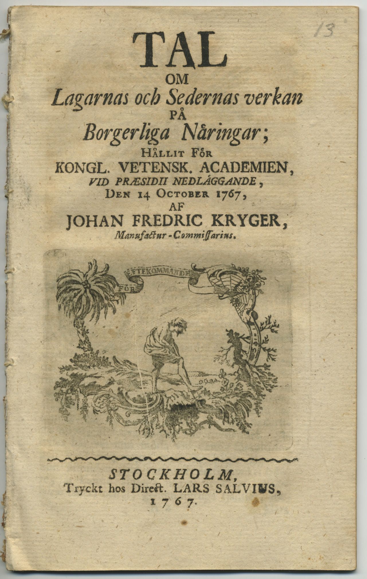 Tal om lagarnas och sedernas verkan på borgerliga näringar; hållit för kongl. Vetensk. academien, vid præsidii nedläggande, den 14 october 1767.