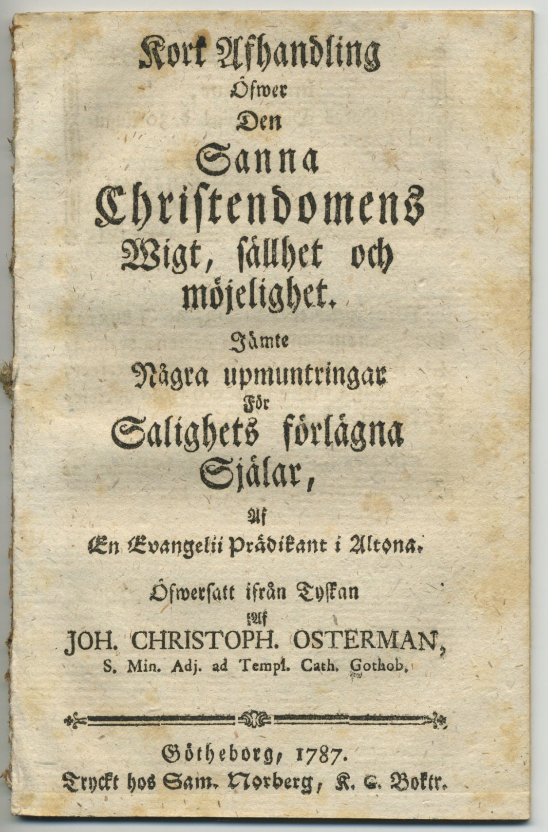 Kort afhandling öfwer den sanna christendomens wigt, sällhet och möjelighet. Jämte några upmuntringar för salighets förlägna själar, af en evangelii prädikant i Altona. Öfwersatt ifrån tyskan af Joh. Christoph. Osterman.