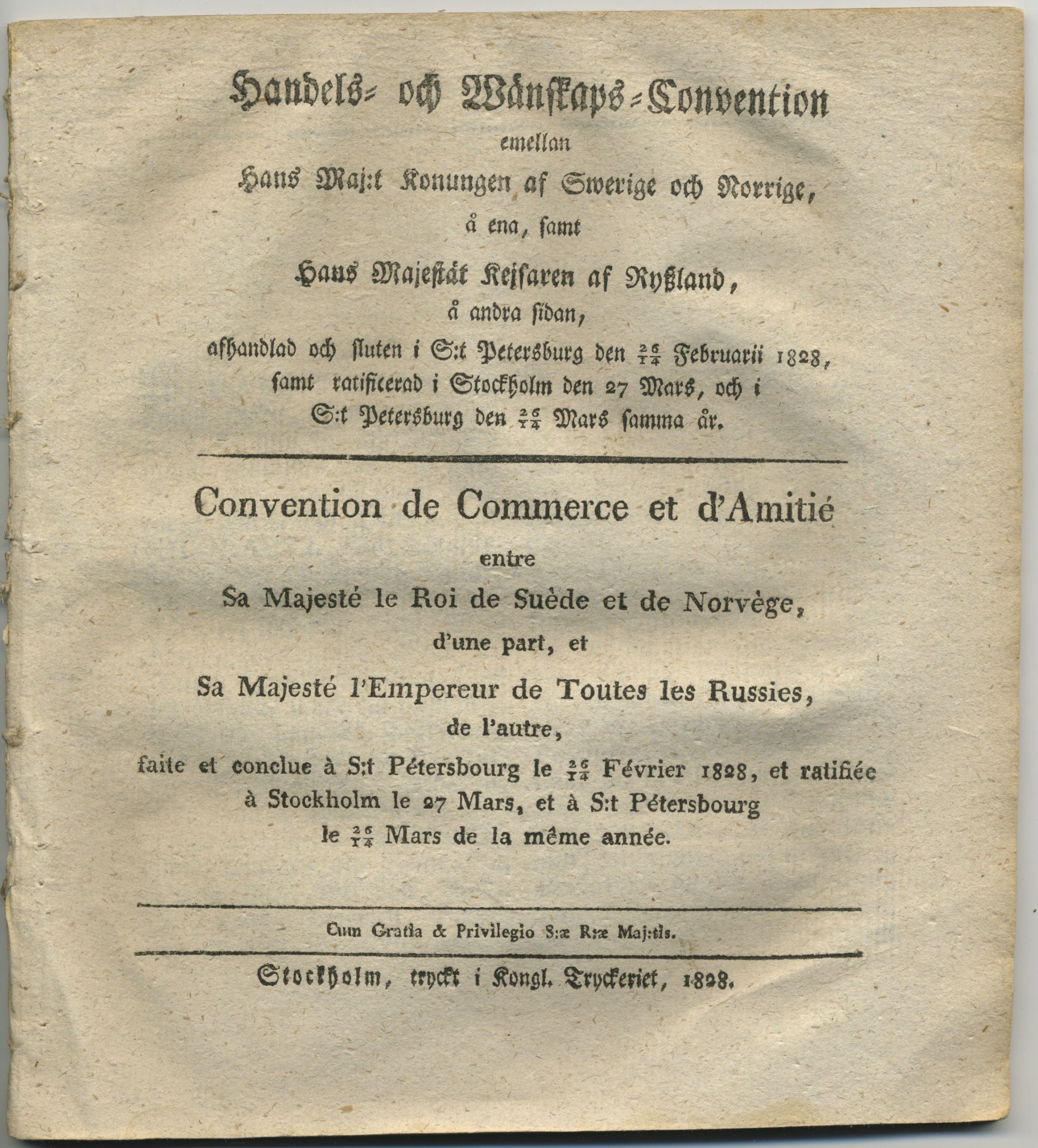 Handels- och wänskaps-convention emellan hans maj:t konungen af Swerige och Norrige, å ena, samt hans majestät kejsaren af Ryssland, å andra sidan, afhandlad och sluten i S:t Petersburg den 26/14 februarii 1828, samt ratificerad i Stockholm den 27 mars, och i S:t Petersburg den 26/14 mars samma år. Convention de commerce et d’amitié entre sa majesté le roi de Suède et de Norvège, d’une part, et sa majesté l’empereur de toutes les Russies, de l’autre, faite et conclue à S:t Pétersbourg le 26/14 fevrier 1828, et ratifiée à Stockholm le 27 mars, et à S:t Pétersbourg le 26/14 mars de la même année.