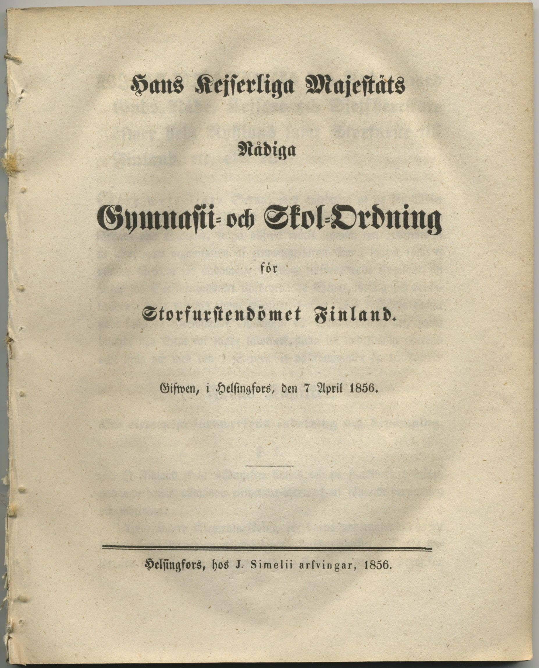 Hans kejserliga majestäts nådiga gymnasii- och skol-ordning för storfurstendömet Finland. Giwfen, i Helsingfors, den 7 april 1856.