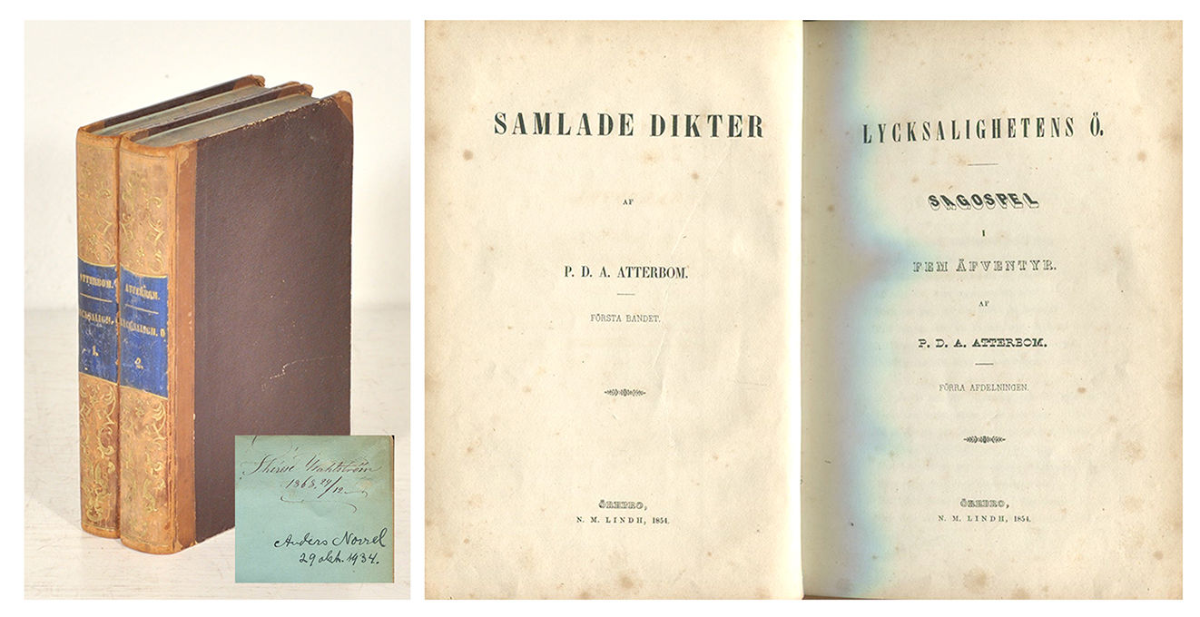 Örebro, N. M. Lindh, 1854. 8:o. XII,(2),285,(1 blank,1) + (6),421,(1) s. Två något nötta samtida hfrbd med rikt guldornerade ryggar och formskurna blå titeletiketter. Marmorerade snitt. Ryggarna något matta och torra samt med lite nötta falsar. Stötta pärmhörn. Llagerfläckiga inlagor. På försättsbladen namnteckningar av Therése Wahlström daterad julafton 1868 respektive Anders Norell daterad den 29 oktober 1934.