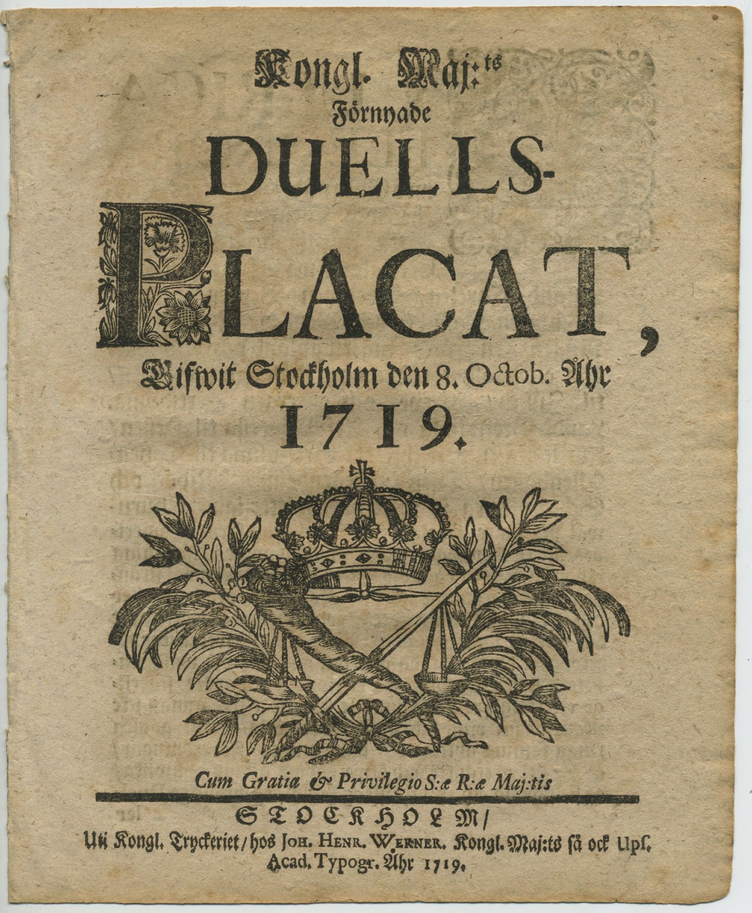 Kongl. maj:ts förnyade duells-placat, gifwit Stockholm den 8 octob. åhr 1719.