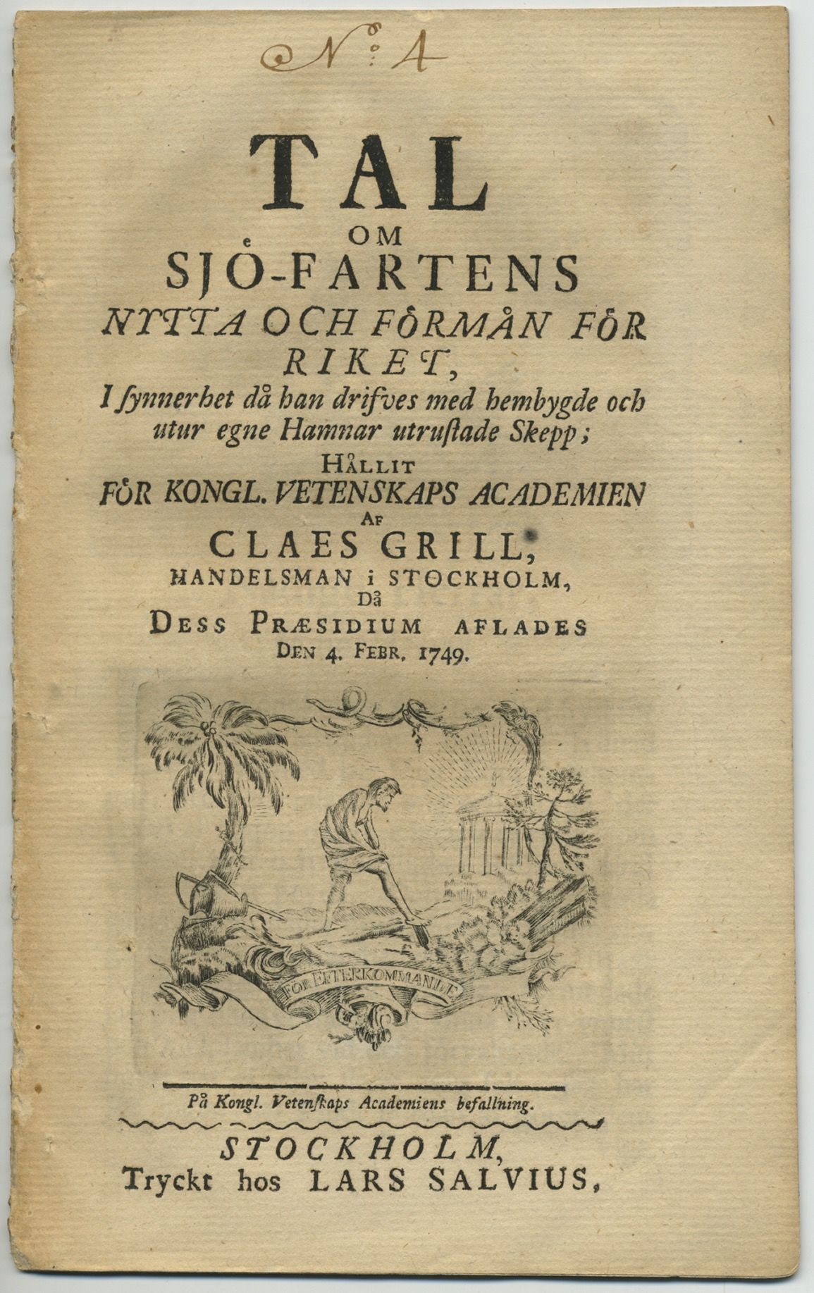 Tal om sjö-fartens nytta och förmån för riket, i synnerhet då han drifves med hembygde och utur egne hamnar utrustade skepp; hållit för kongl. Vetenskaps academien |...] då dess præsidium aflades den 4 febr. 1749.