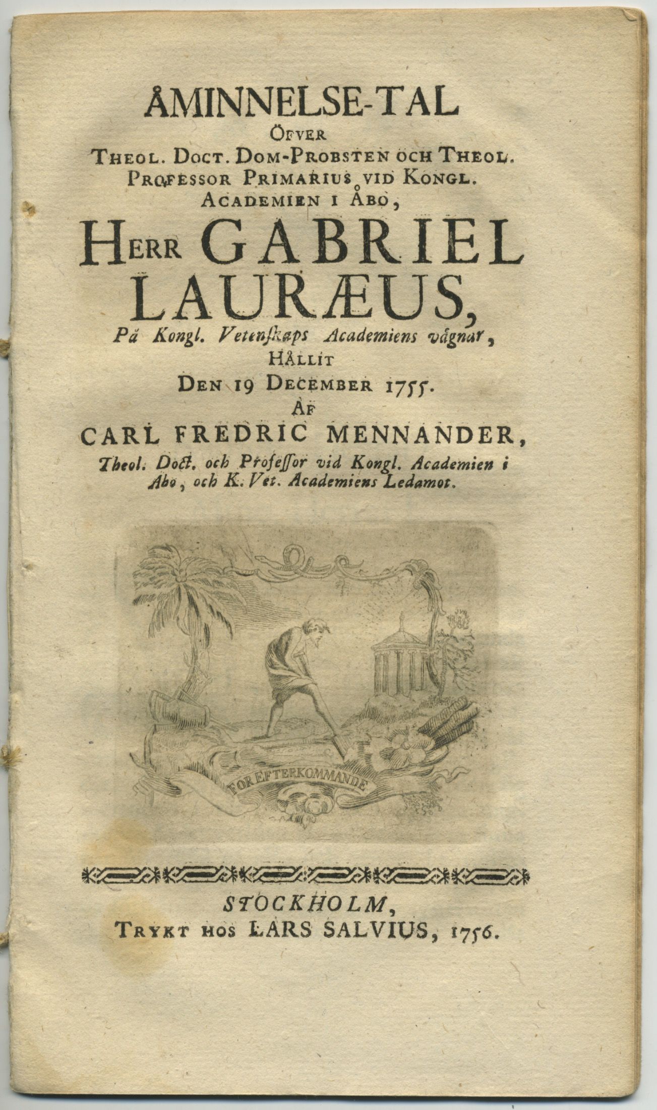 Åminnelse-tal öfver theol. doct. dom-probsten och theol. professor primarius vid kongl. academien i Åbo, herr Gabriel Lauræus, på kongl. Vetenskaps academiens vägnar, hållit den 19 december 1755.
