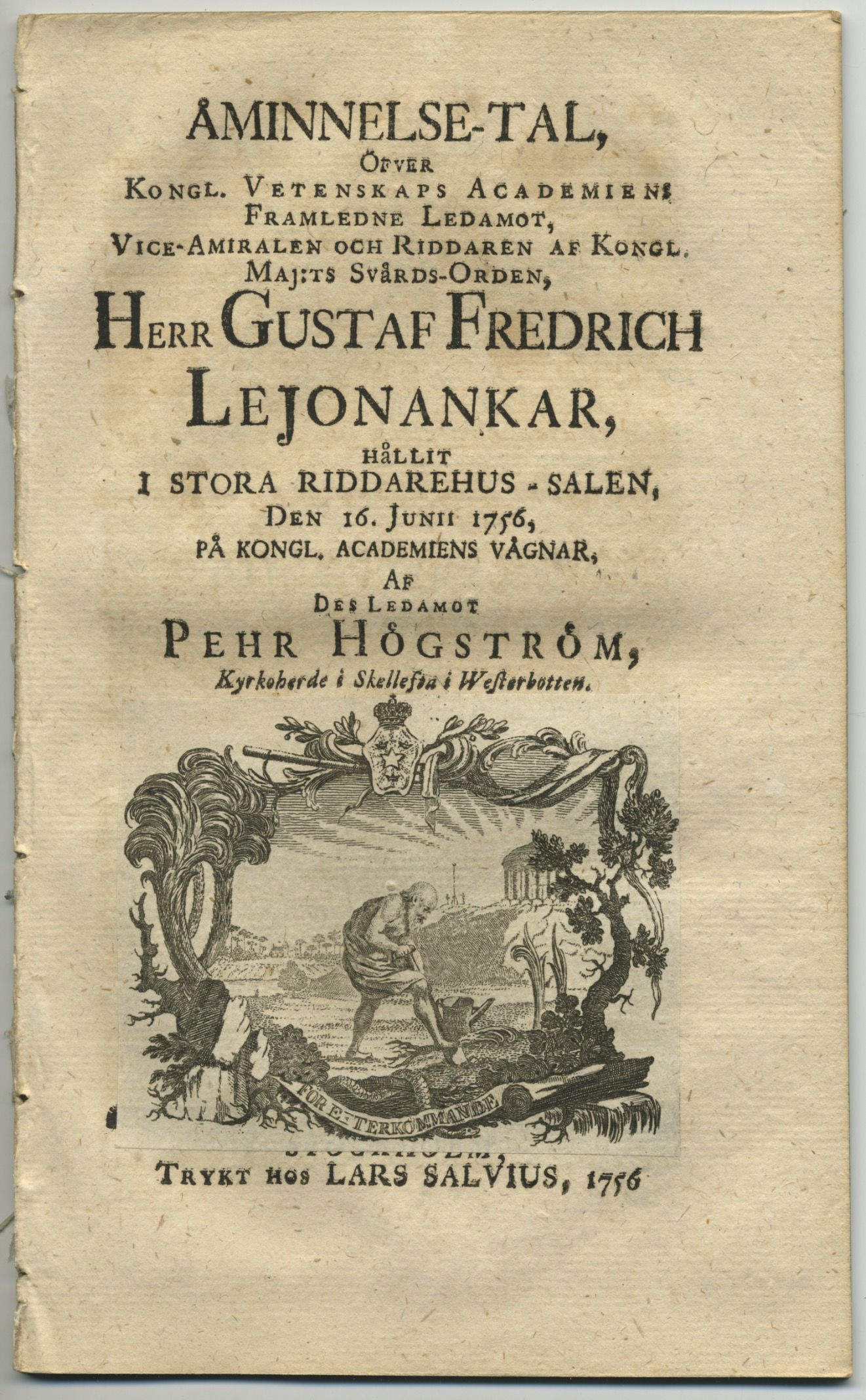 Åminnelse-tal, öfver kongl. Vetenskaps academiens framledne ledamot, vice-amiralen och riddaren af kongl. maj:ts Svärds-orden, herr Gustaf Fredrich Lejonankar, hållit i stora Riddarhus-salen, den 16 junii 1756, på kongl. academiens vägnar, af des ledamot.