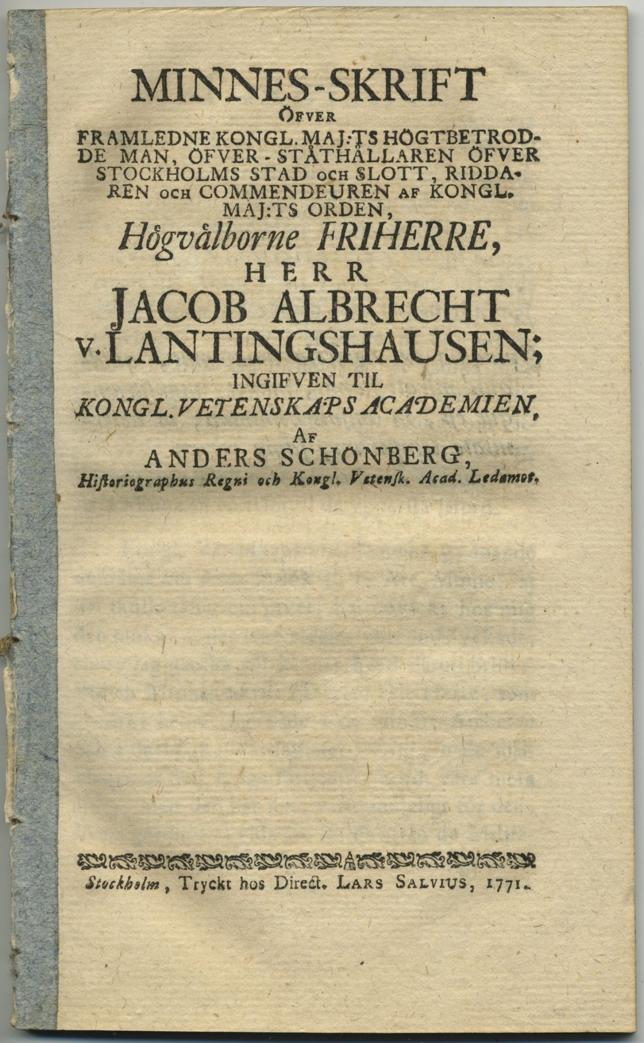 Minnes-skrift öfver framledne kongl. maj:ts högtbetrodde man, öfver-ståthållaren öfver Stockholms stad och slott, riddaren och commendeuren af Kongl. maj:ts orden, högvälborne friherre, herr Jacob Albrecht v. Lantingshausen; ingifven til kongl. Vetenskaps academien.