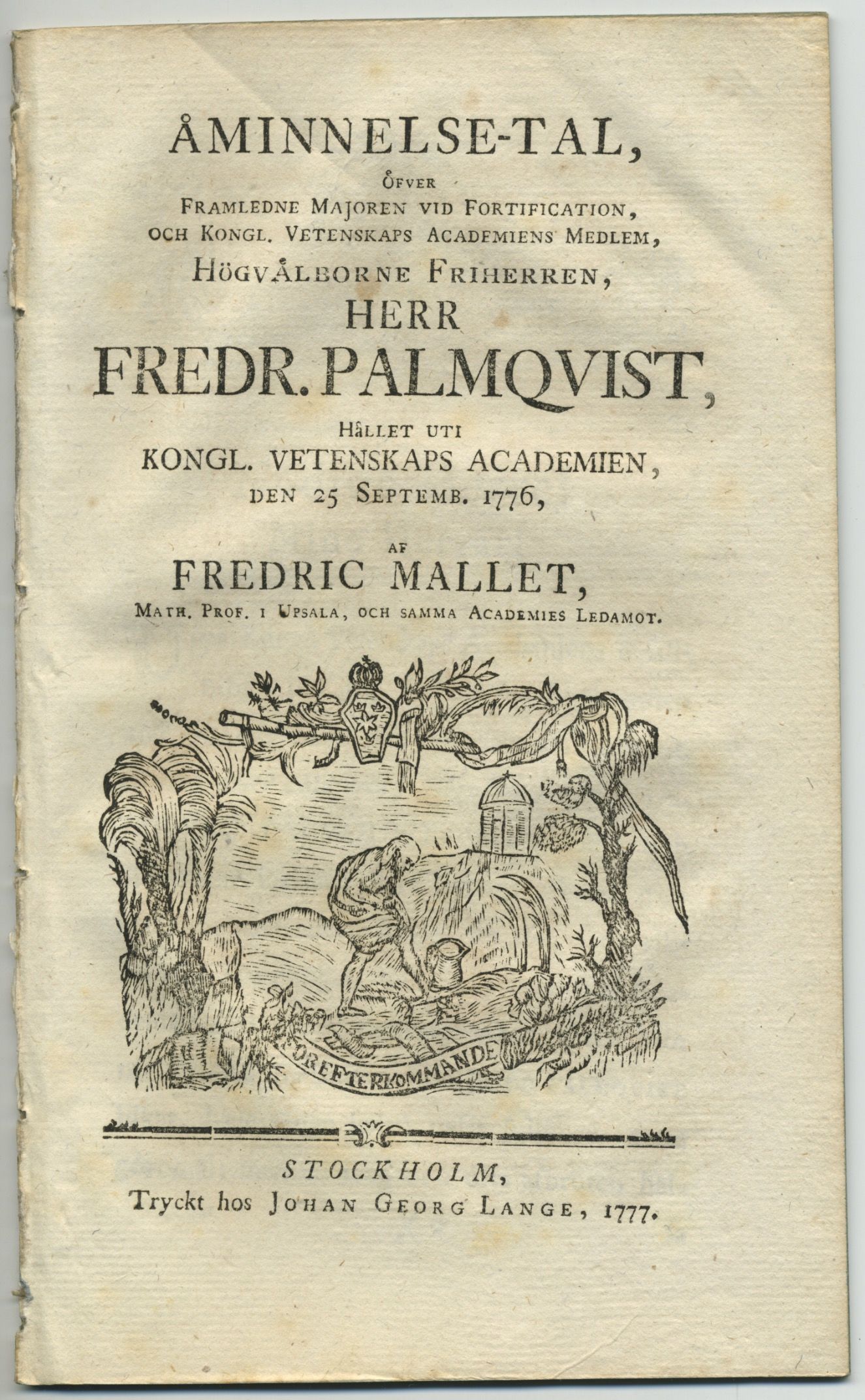 Åminnelse-tal, öfver framledne majoren vid fortification, och kongl. Vetenskaps academiens medlem, högvälborne friherren, herr Fredr. Palmqvist, hållet uti kongl. Vetenskaps academien, den 25 septemb. 1776.