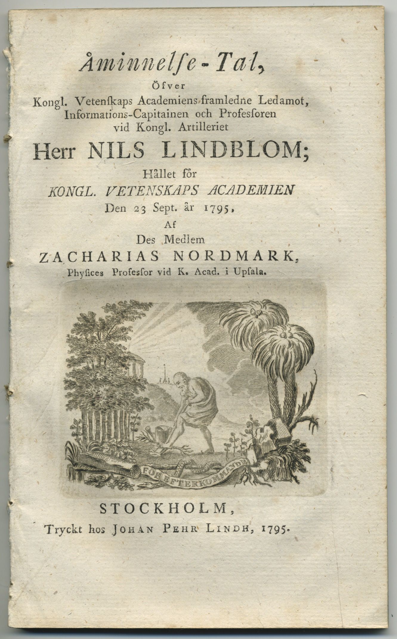 Åminnelse-tal, öfver kongl. Vetenskaps academiens framledne ledamot, informations-capitainen och professoren vid kongl. artilleriet herr Nils Lindblom; hållet för kongl. Vetenskaps academien den 23 sept. år 1795, af des medlem.