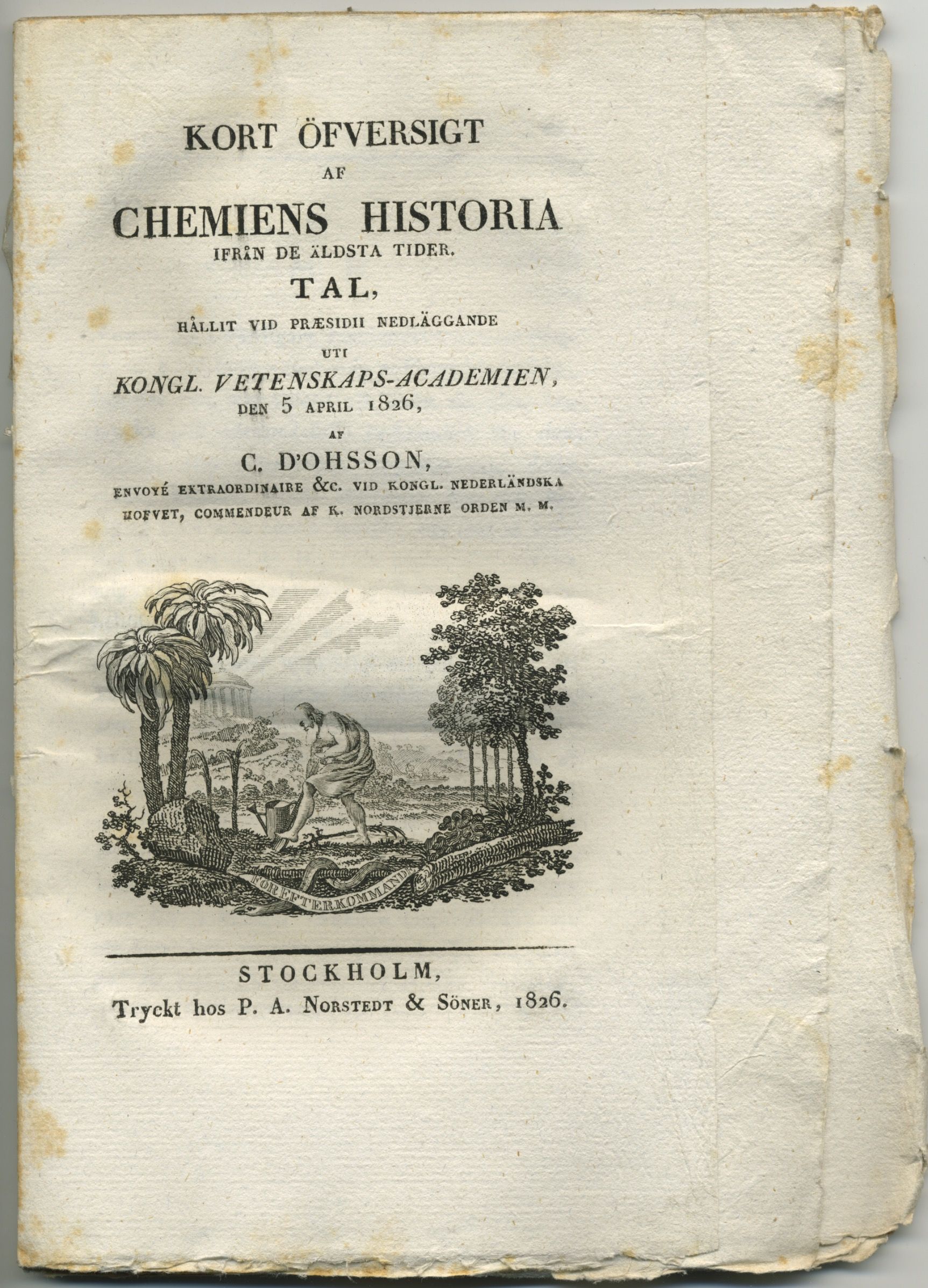 Kort öfversigt af chemiens historia ifrån de äldsta tider. Tal, hållit vid præsidii nedläggande uti kongl. Vetenskaps-academien, den 5 april 1826.