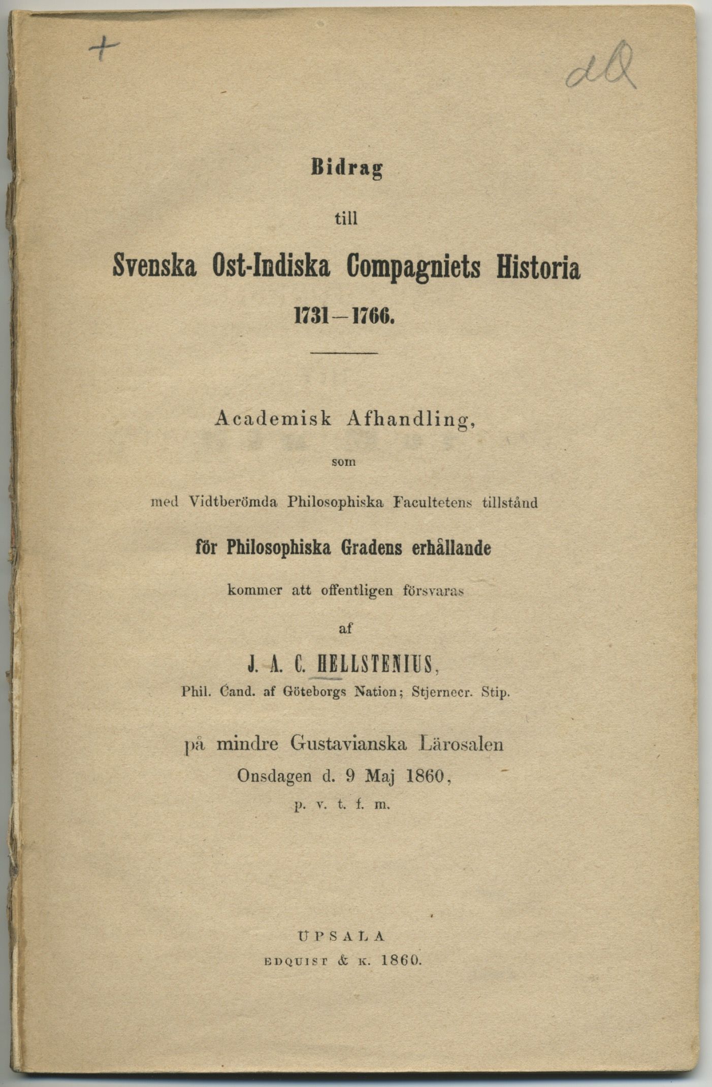 Uppsala, Edquist & k., 1860. 8:o. (4),49 s. Tagen ur band. Några ljusbruna fuktfläckar på sista bladet.
