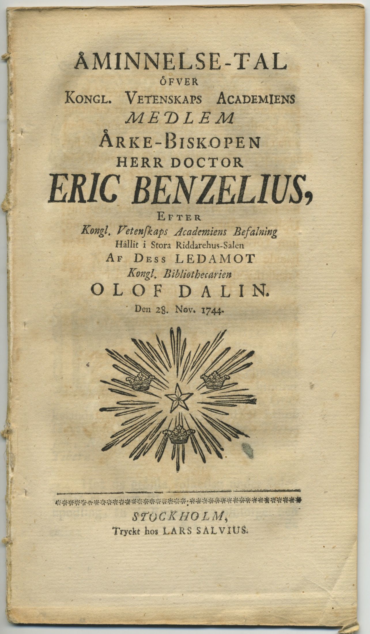 Åminnelse-tal öfver kongl. Vetenskaps academiens medlem ärke-biskopen herr doctor Eric Benzelius, efter kongl. Vetenskaps academiens befalning hållit i stora riddarehus-salen [...] den 28 nov. 1744.