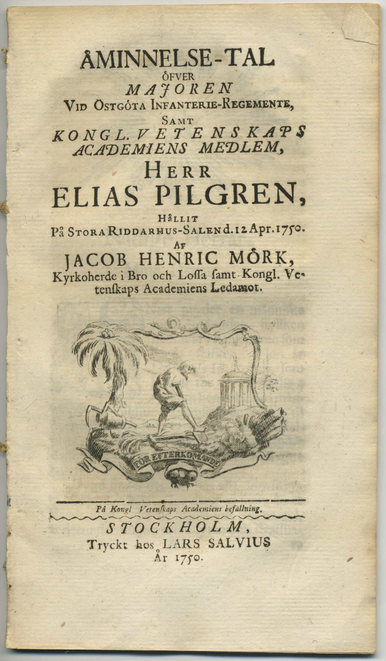 Åminnelse-tal öfver majoren vid Östgöta infanterie-regemente, samt kongl. Vetenskaps academiens medlem, herr Elias Pilgren, hållit på stora Riddarhus-salen d. 12 apr. 1750.