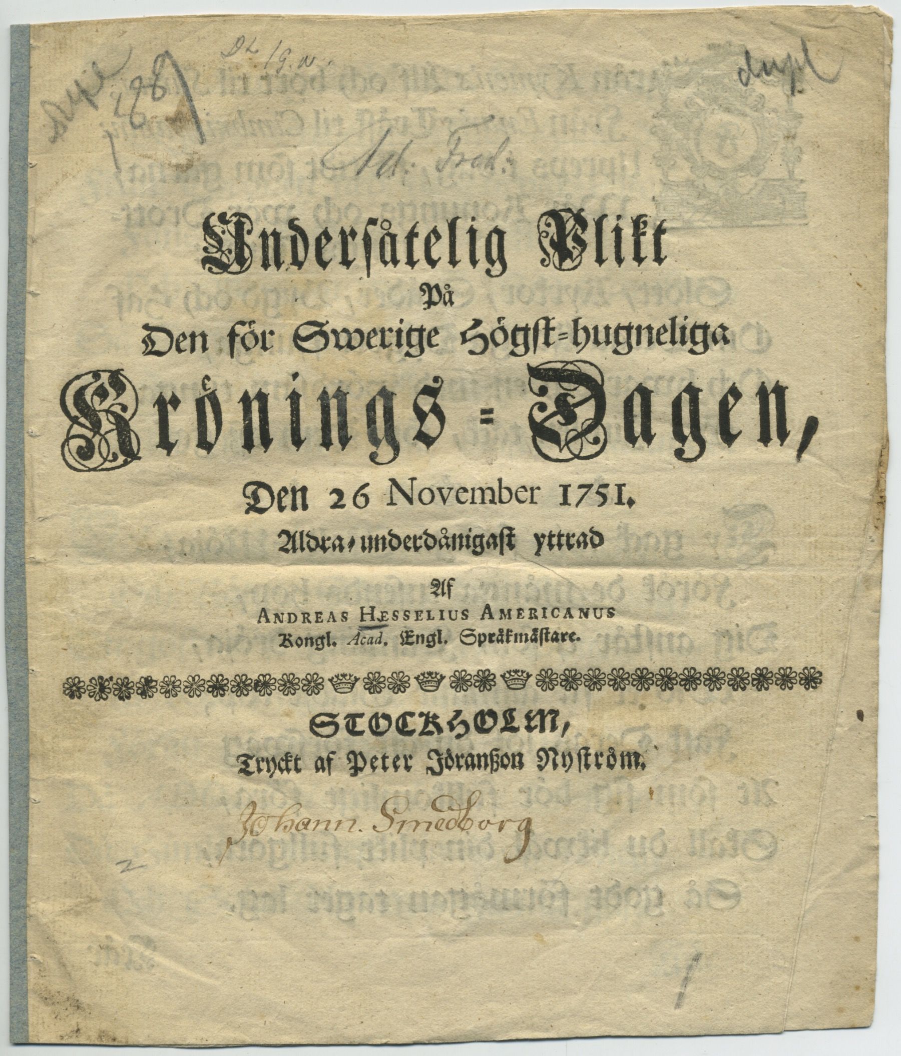 Sthlm, P. J. Nyström, (1751). 4:o. (8) s. Tagen ur band och insatt i ny gråpappersryggremsa. Har varit vikt och är lite skrynklig. De två första bladen snett klippta i yttermarginalen. Fuktfläck i yttermarginalen på de två sista bladen. Sista sidan något solkig. Johann. Smedborgs vackra samtida namnteckning på titelbladet. Ett antal duplettmarkeringar i blyerts.