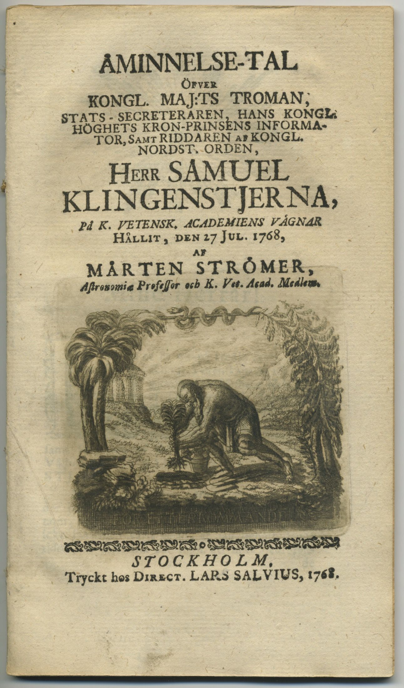 Åminnelse-tal öfver kongl. maj:ts troman, stats-secreteraren, hans kongl. höghets kron-prinsens informator, samt riddaren af kongl. Nordst. orden, herr Samuel Klingenstjerna, på k. Vetensk. academiens vägnar hållit, den 27 jul. 1768.