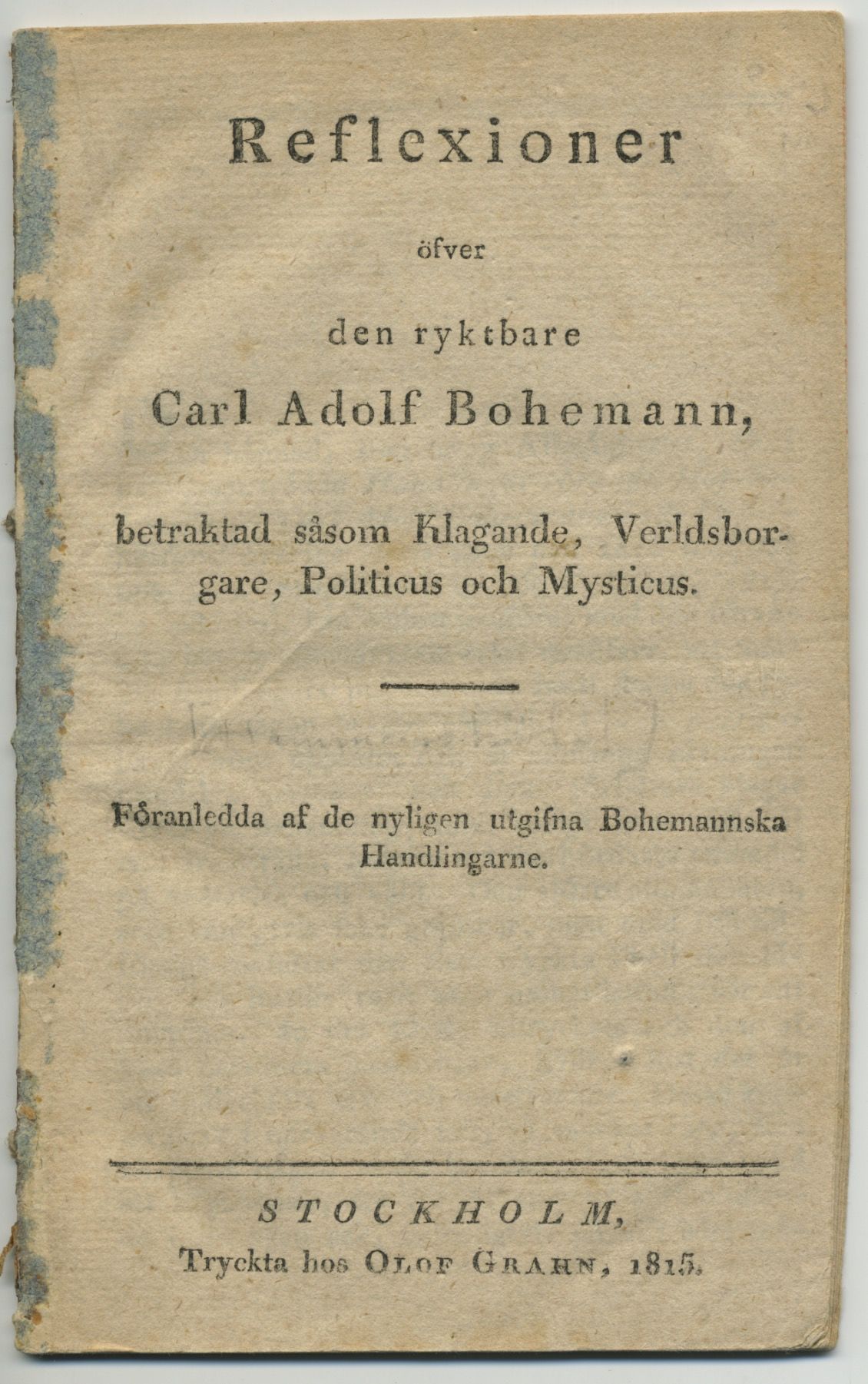 Reflexioner öfver den ryktbare Carl Adolf Bohemann, betraktad såsom klagande, verldsborgare, politicus och mysticus. Föranledda af de nyligen utgifna Bohemannska handlingarne.